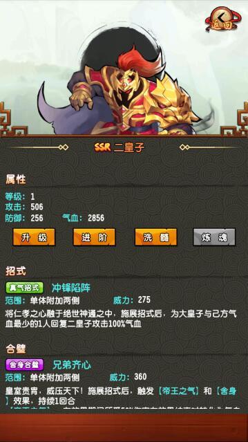 在高级别的道友当中,SSR级的二皇子就是必须培养的一名奶妈。该角色在战斗当中,通过对敌人进攻的时候,对己方的道友们进行生命值的恢复。并且恢复生命值的比例依靠二皇子的攻击力。