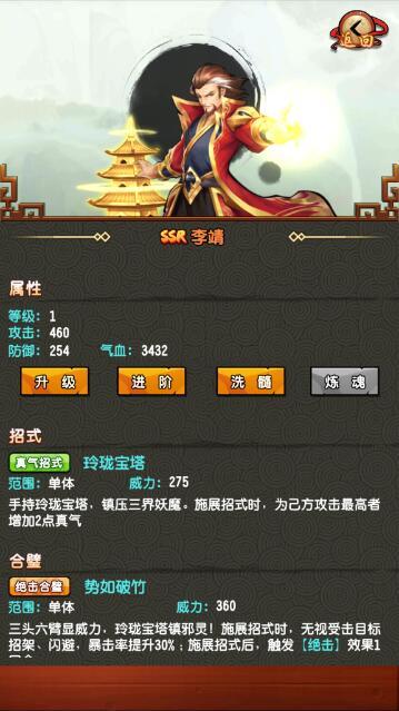 李靖在战斗的过程当中,主要以玲珑宝塔攻击对手,在使用技能的时候,可以对敌人群体造成伤害,并且会直接帮助玩家阵容当中攻击力最高的角色,恢复2点真气值。利用好李靖的这一特性,可以快速的稳定队伍的输出。