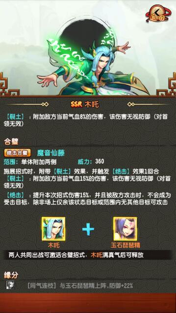 该效果主要会对敌人造成自身气血值8%的伤害,同样会直接无视掉敌人的防御力。基本上在使用该技能之后,敌人阵容当中的大部分都会直接被木吒给消灭掉。合璧技能方面,木吒可以和玉石琵琶精使用魔音仙藤。