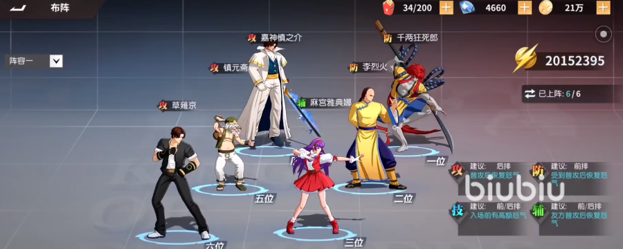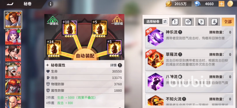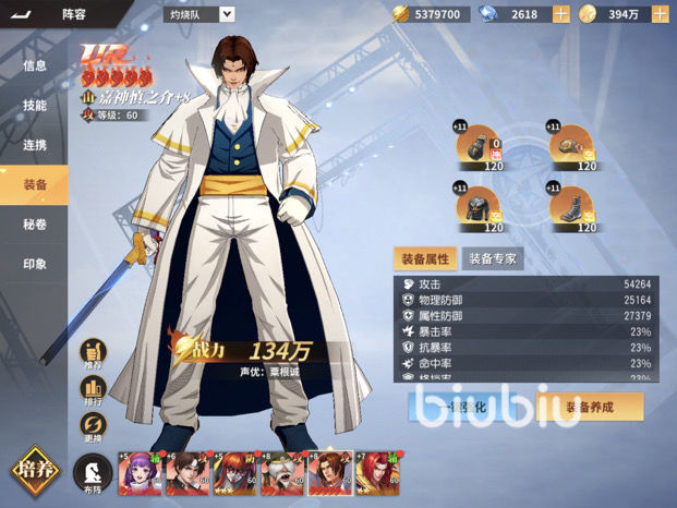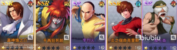 而要以灼烧伤害来打输出的话,建队核心就是要选用灼烧角色,山系的嘉神慎之介就是灼烧队的核心。嘉神作为叠灼烧的主力选手,和老头子镇元斋以及火神草薙京一起构成后排输出,李烈火和千两狂死郎组成前排,雅典娜一个万金油辅助。