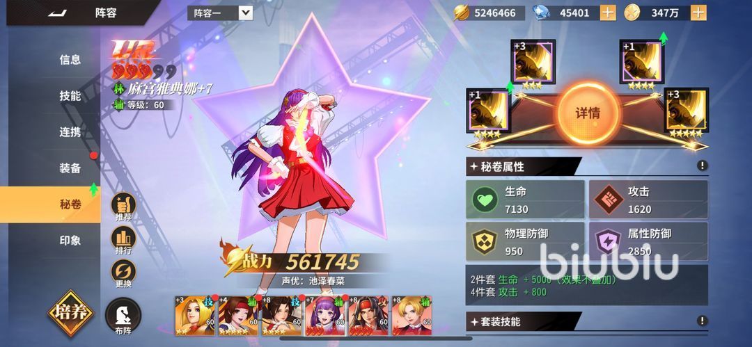 林系的强力人物有麻宫雅典娜,这个先在超能力战士登场的女主角后来在拳皇中非常活跃,在游戏也是公认的实用角色,开局就送的辅助角色,拥有高的单体治疗量并且还能附赠格挡和减免伤害,不需要投入多少资源就可以很好用的角色。