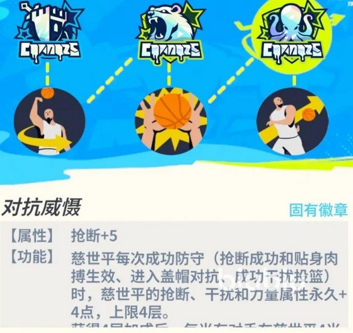 在使用技能的时候会不断积攒慈世平的被动,也就是斗气点数,并且会同步增强其得分命中率,干扰范围减少、防守对抗的成功率提升等等多项能力。被动叠满之后更是能消耗全部斗气点数来强制终止对手的扣篮或者投篮技能,非常BT的一个效果,甚至能直接将对手撞个底朝天。