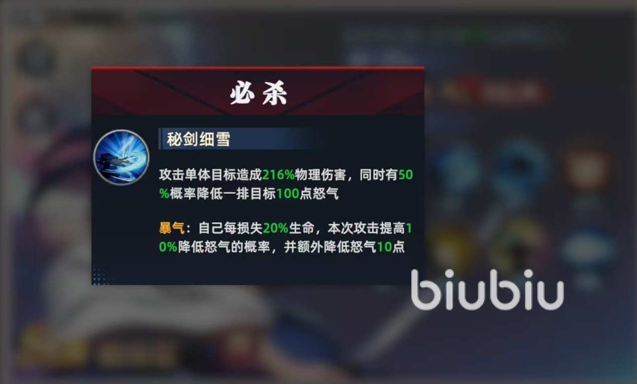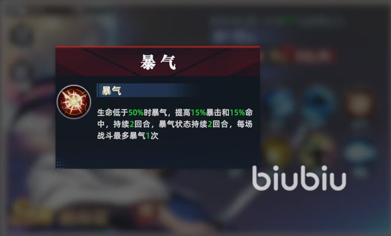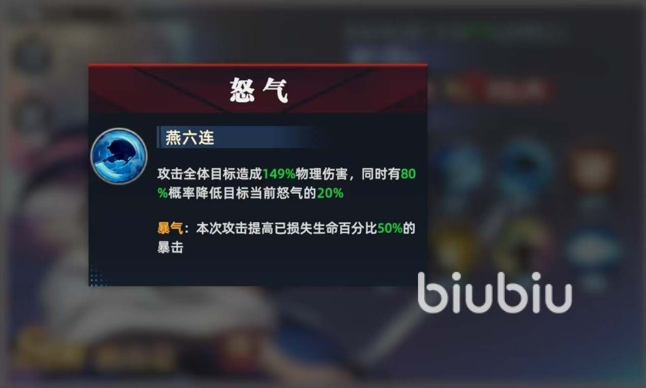 怒气技能效果是攻击全体目标,造成物理伤害,有80%几率降低目标当前20%怒气。在爆气状态下,本次攻击按照损失生命值的50%来提升暴击,也就是血量损失越高,使用大招时触发暴击的几率就越高,所以后期的橘右京输出同样可观。在生命值低于50%的时候就可以触发爆气,提高15%暴击和15%命中,持续两回合。这就意味着在战斗的后期才是橘右京发挥威力的时候,一旦触发爆气,快速使用出必杀和怒气技能,将会给敌方带来沉重的打击。