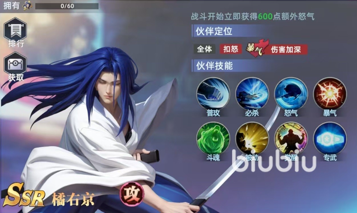橘右京定位是攻击型的角色,它具有伤害加深、扣除对方怒气等一系列特点,在战斗开始时立即获得600点额外怒气,这使得他在开战之后就可以打出非常好的爆发输出。必杀技攻击单体目标,造成物理伤害后,有几率降低一排目标100点怒气,在暴击的状态下,自身每损失20%的生命值,就能够提高10%降低怒气的几率。这样的技能特点非常适合限制对方的发挥,毕竟作用于一排目标,而且几率不低。
