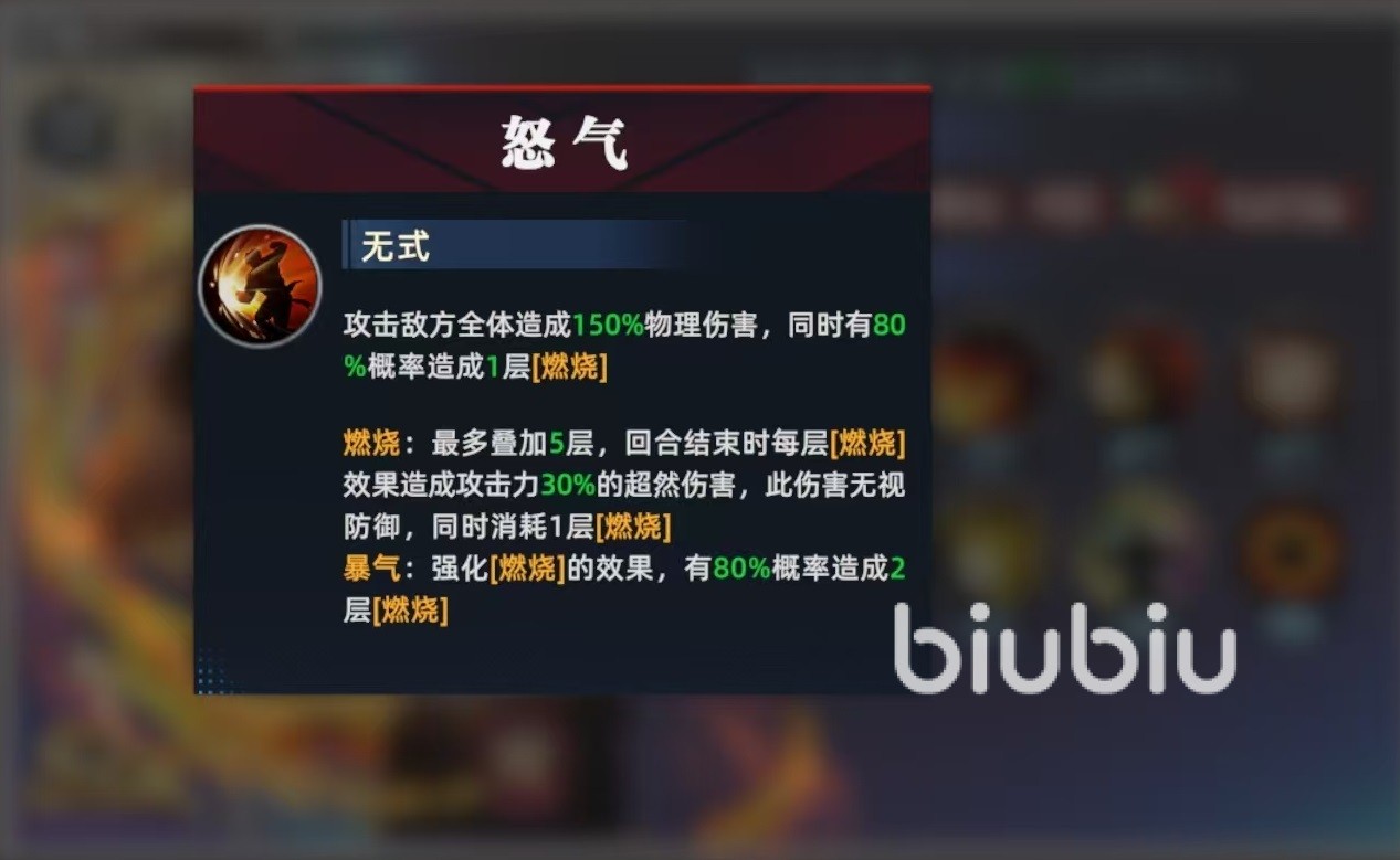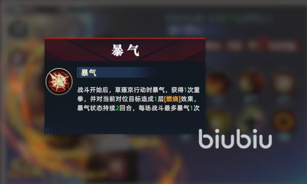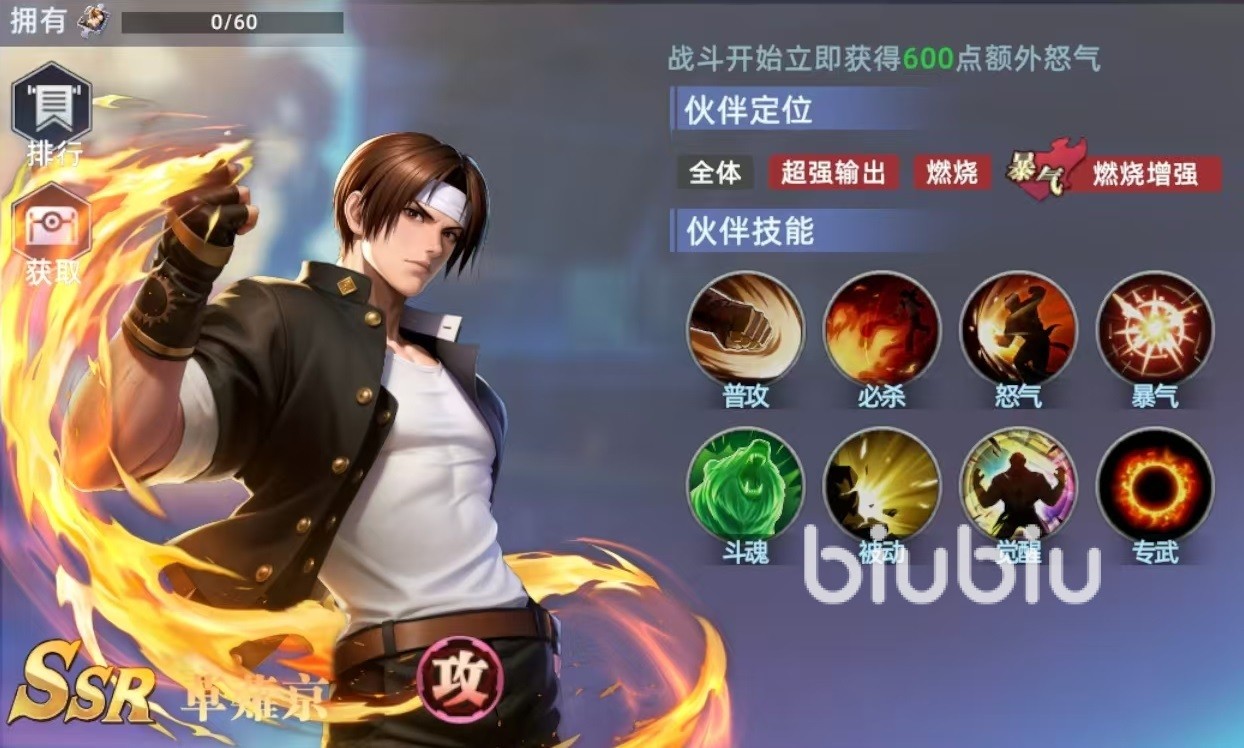 草薙京是属于SSR品质的攻击型选手,自身的定位是具有超强输出,还具有燃烧以及燃烧增强的额外效果。战斗开始时可立即获得600点额外怒气,所以短回合内就能打出很高的爆发输出。自身的爆气在战斗开始,行动时直接就能触发,获得一次重拳,并对当前的对位目标造成一层燃烧效果,爆气状态持续两回合。这样的爆气就和其他角色有所不同,开局即爆发。