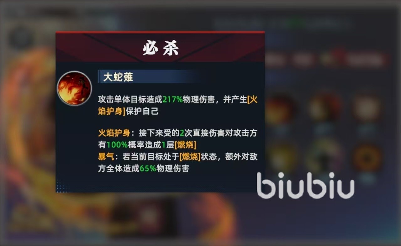 在技能方面,必杀技效果是攻击单体目标,造成高额物理伤害后,获得火焰护身保护自身。在火焰护身的影响下,接下来受到的两次直接伤害,会对攻击目标造成一层燃烧。在爆气的状态下,如果输出目标处于燃烧状态,那么额外对敌方全体造成一次物理伤害。也就是如果是带有燃烧状态的目标来攻击草薙京,并且草薙京处于暴气状态下,那么对方全体就会受到一次输出。