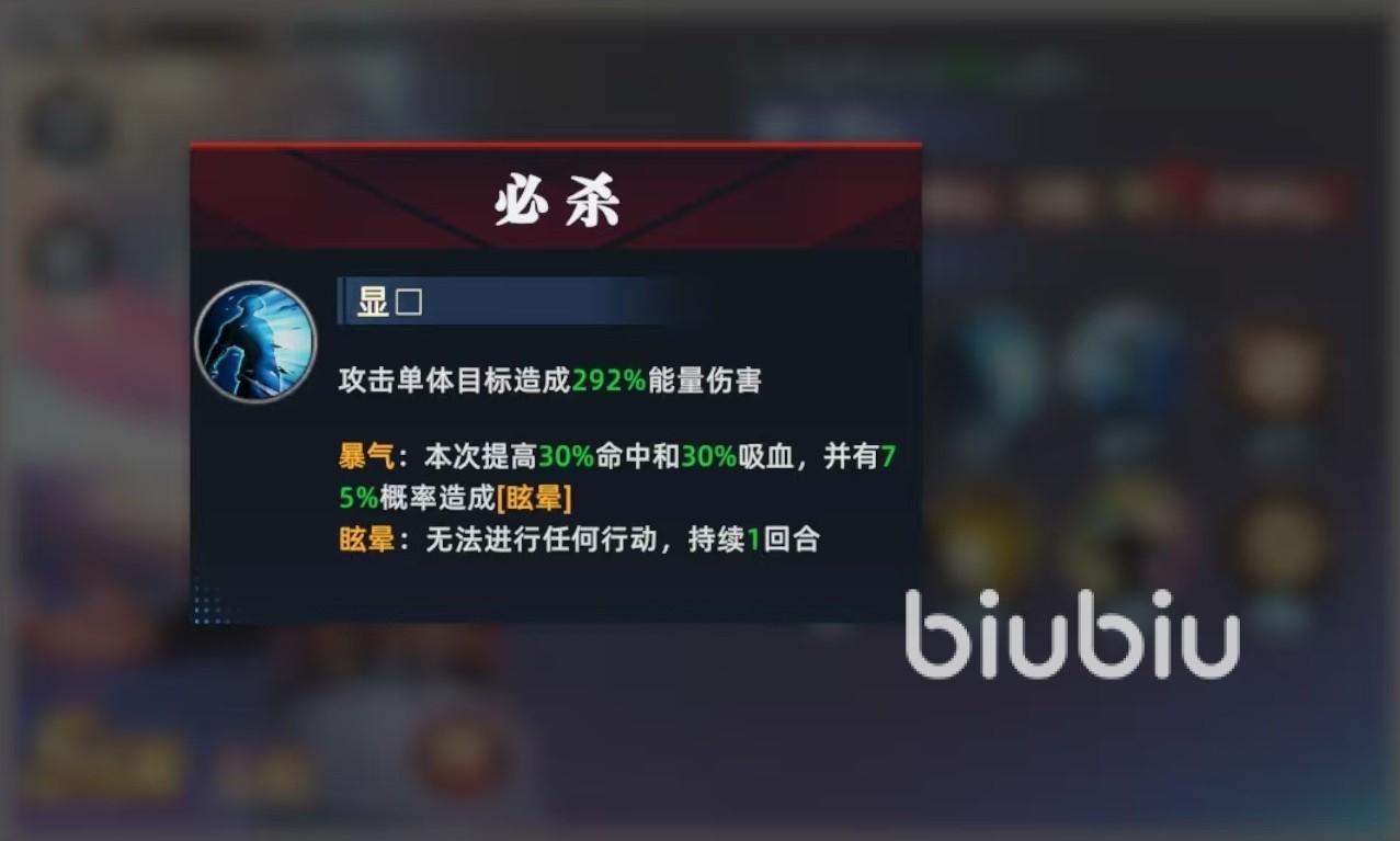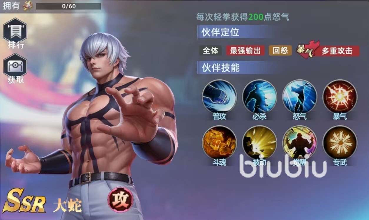 必杀技攻击敌方单体目标,造成高额能量伤害,在爆气状态下,本次攻击可以提高命中率和获得额外吸血效果,并有几率造成眩晕,一回合内无法进行任何行动。怒气技能攻击对方全体目标造成能量伤害,对于当前生命值最高的单位,额外造成一次伤害,并释放领域大蛇之血。此效果对全体伙伴生效,提升20%伤害、免伤和25%吸血效果,并获得一次重拳,领域持续一回合。爆气状态下额外攻击次数提高,并且单独判定生命值最高的目标,也就是输出之后,如果对方血量降低了,会切换成另外一个血量最高的继续打伤害。