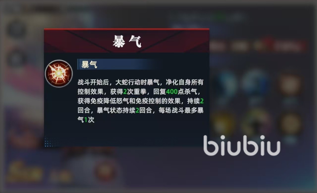 大蛇号称是目前游戏中的最强输出,它的爆气具有多重攻击效果,输出非常出色。在战斗开始的时候,大蛇行动时就能触发爆气,将自身所有的控制效果全部净化掉,获得两次重拳的机会,并恢复400点杀气。同时自身获得免疫降低怒气和免疫控制的效果,持续两回合。这个爆气效果可以说是所有角色中非常全面的一个,自身能够毫无顾忌的输出,不惧怕对方控制,又能打出重拳重创对手。