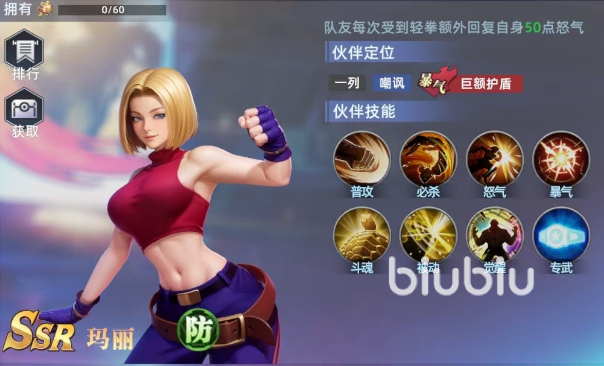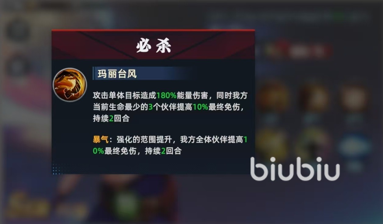 玛丽是属于游戏中的防御型角色,只要队友每次打出侵权,他都可以额外恢复50点怒气。自身的爆气是在生命值低于50%的时候,使用立即回复200点杀气,获得一个20%最大生命值的护盾。必杀技攻击单体目标,造成能量伤害,同时为我方当前生命最少的三个伙伴提供10%的最终免伤,在爆气的强化之下,我方全体伙伴都能获得10%的最终免伤。