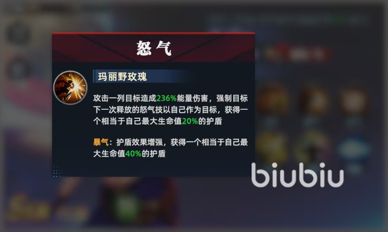 怒气技能是攻击一列的敌方目标,造成能量伤害并强制目标下一次释放的怒气技能,以玛丽为目标,并获得一个20%生命值的护盾。在爆气强化下,护盾效果加强,数值提升到40%。从这些技能效果可以看出,玛丽的作用就是嘲讽对方,保护队友尽量少受到伤害,然后带来巨额的护盾加成,对于整个团队都能提升生存能力。装备选择方面当然也是以团队为主,主要包括铁壁星霜甲和刃影流衫这两个套装可以选择。
