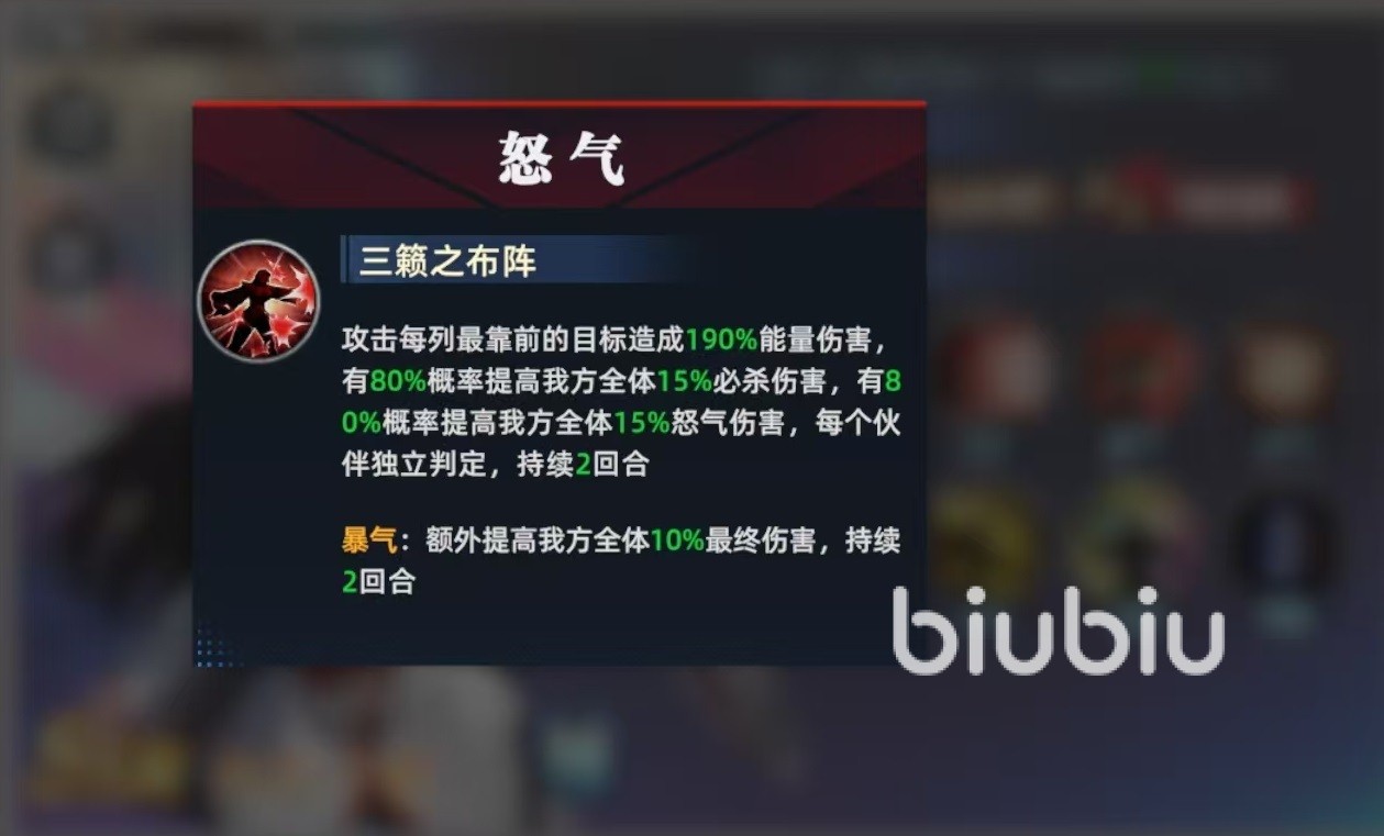 神乐千鹤的必杀技是攻击对方单体目标,造成能量伤害。有60%的几率使目标无法释放必杀技,在爆气状态下,还有60%几率使目标无法释放怒气。如果运气比较好,几乎将对方的全部输出手段都封住,实战中意义非常大。怒气技能攻击列最靠前的目标,造成能量伤害,有80%几率提高我方全体15%必杀伤害,80%几率提高我方全体15%的怒气伤害,这两个是独立判定的,所以在战斗中几乎可以做到必定触发一个,运气较好还可以全部触发。