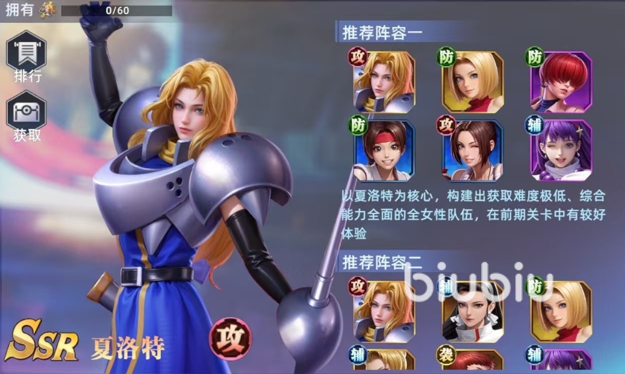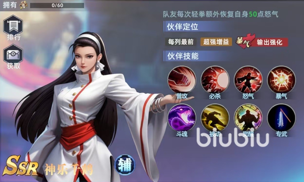 作为一名女性格斗家,神乐千鹤的辅助能力非常强,她具有超强的增益效果,爆气还可以带来输出强化。队友的每次轻拳都可以为神乐千鹤额外恢复50点怒气。在首回合开始时,神乐千鹤直接爆气获得一次重拳,并使我方攻击力最高的伙伴,首次怒气技能提高30%的伤害。这样再搭配上一些能够额外获得怒气的格斗家,在首回合就可以打出非常狂暴的输出。