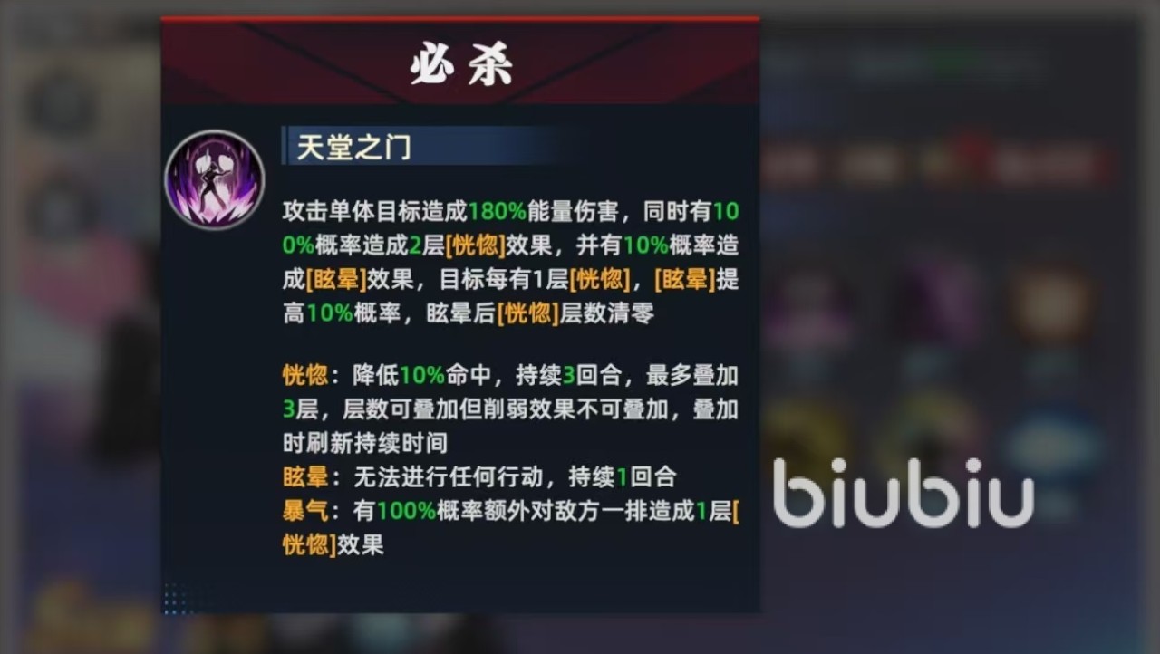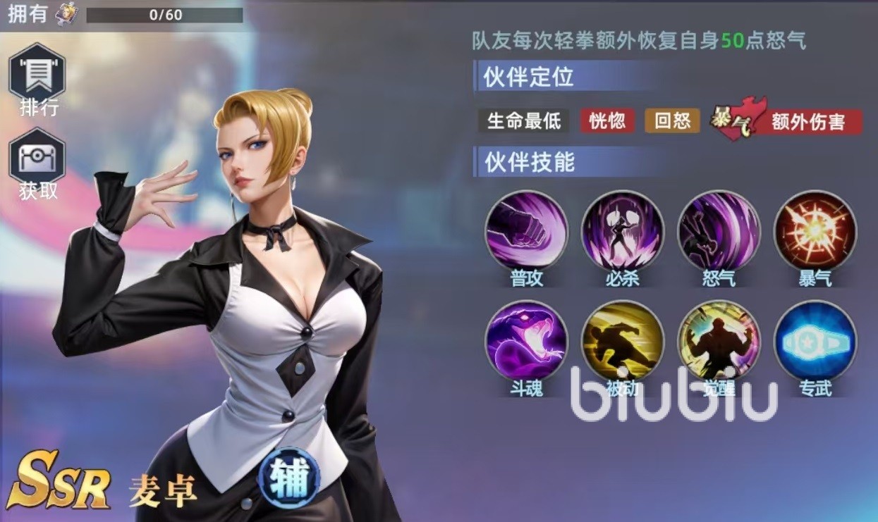 麦卓在第二回合开始行动时就能触发爆气,提升我方10%攻击力,持续两回合。爆气效果是属于全队性质,对于整个队伍的输出都有着明显加强,尤其是那些在开局就有爆发的格斗家,更是适合和麦卓一起组队。必杀技可以攻击单体目标,同时有几率造成恍惚效果和眩晕效果,对方身上每带有一层恍惚,眩晕的概率就能提高10%。