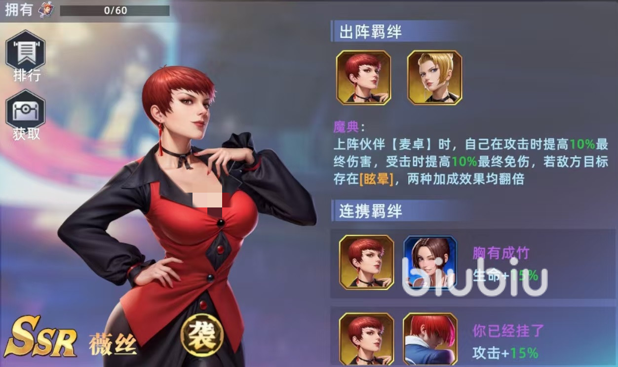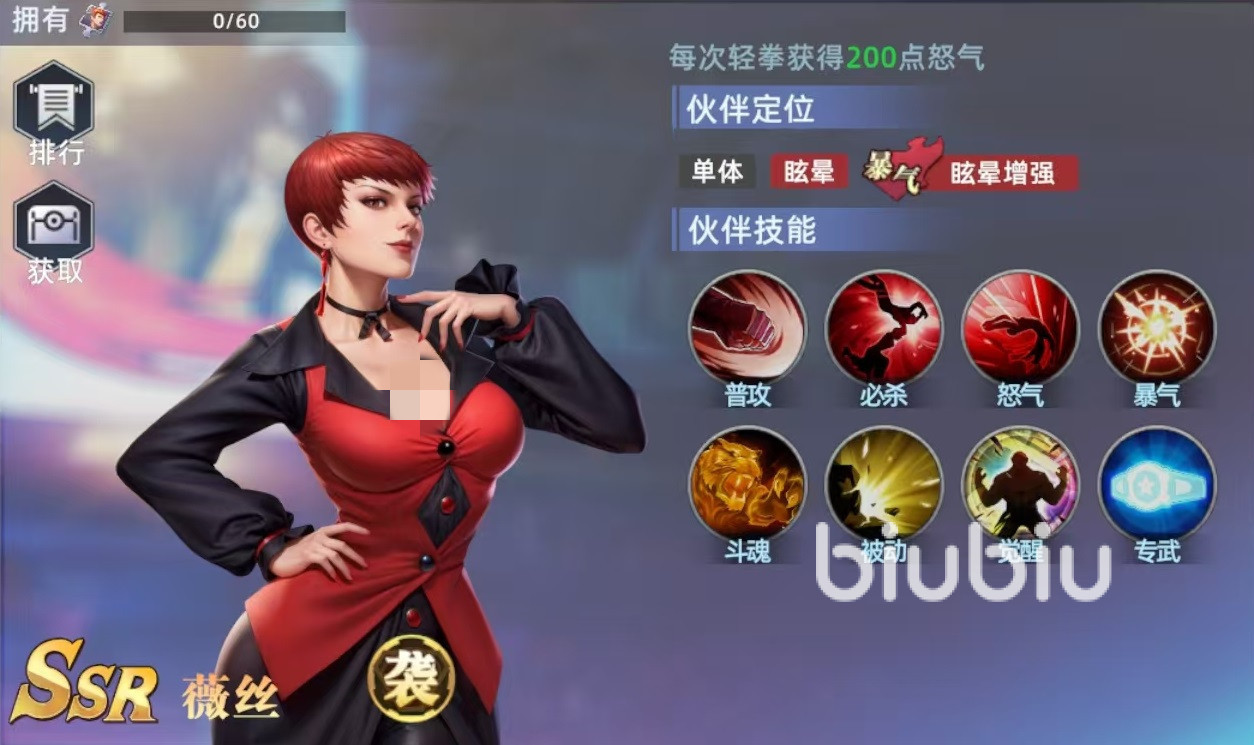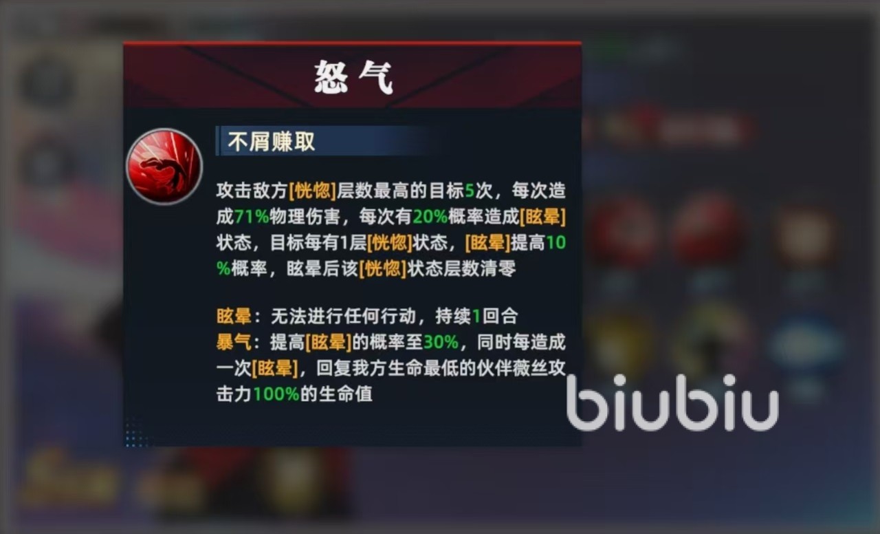 薇丝需要再释放一次重拳后触发爆气,提升10%最终伤害和效果命中,持续三个回合,爆气状态能持续三个回合,这是比较特别的地方。必杀技是攻击单体目标,有几率造成两层的恍惚效果,恍惚可以削弱对方的命中,最多叠加三层,在爆气的强化下,有几率额外对敌方一列造成恍惚。