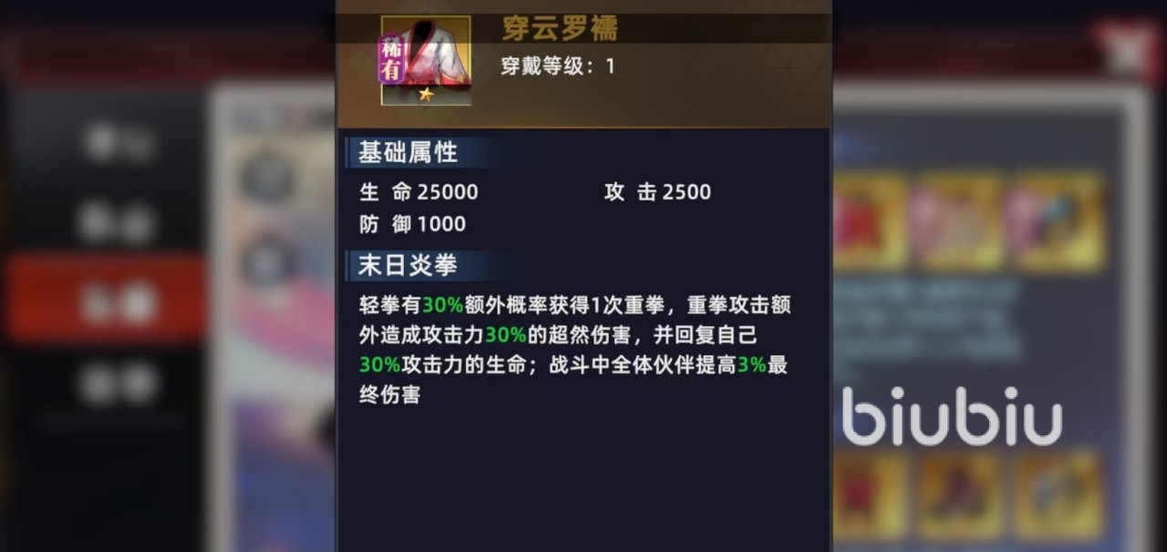 怒气技能是攻击对方身上恍惚层数最高的目标5次,每次都有概率造成眩晕,对方身上的恍惚状态,会提高眩晕的几率。这个技能虽然单体伤害不算高,但是每一次都是独立判定,所以触发的几率很高。在爆气的强化下,眩晕几率提升,每触发一次眩晕,就可以为血量最低的伙伴恢复一次生命值。因为这个格斗家是通过打出轻拳来获得怒气,所以装备比较推荐穿云罗襦,这套装备利用轻拳攻击可额外获得重拳次数,这样就能快速触发爆气。会根据穿戴者的正面和负面效果,提高战斗能力。