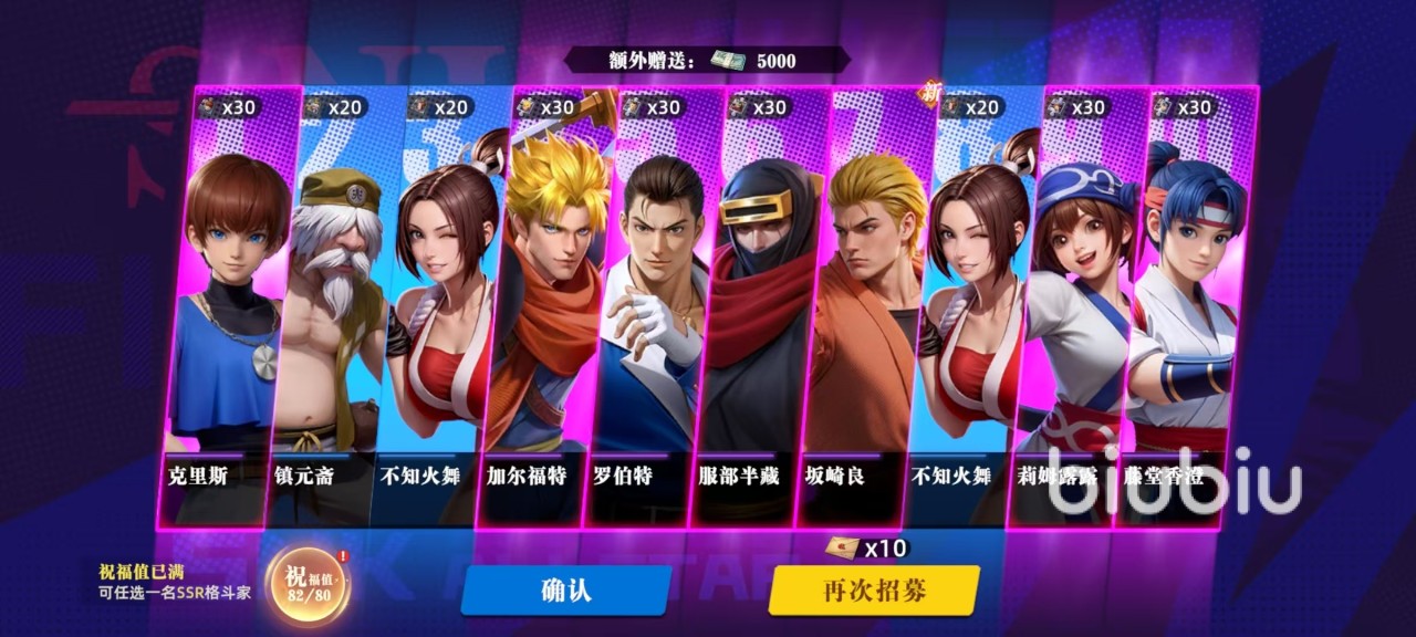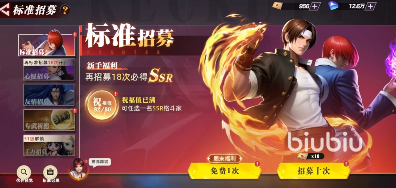 这款游戏是将格斗家和专武都做到了同一个招募页面,里分为角色池和专武池。以下角色持招募分为标准招募、心愿招募、友情招募这三类,专武分为专武祈愿这一个池。标准招募是大家第1个可以接触到的池子,这里可以抽到非稀有品质的SSR级别角色。累计招募达到80次之后可以触发祝福,也就是额外获得一次获得指定SSR品质的伙伴。如果是在招募中已经获取到的伙伴,将会自动转换成碎片,用于提升星级。