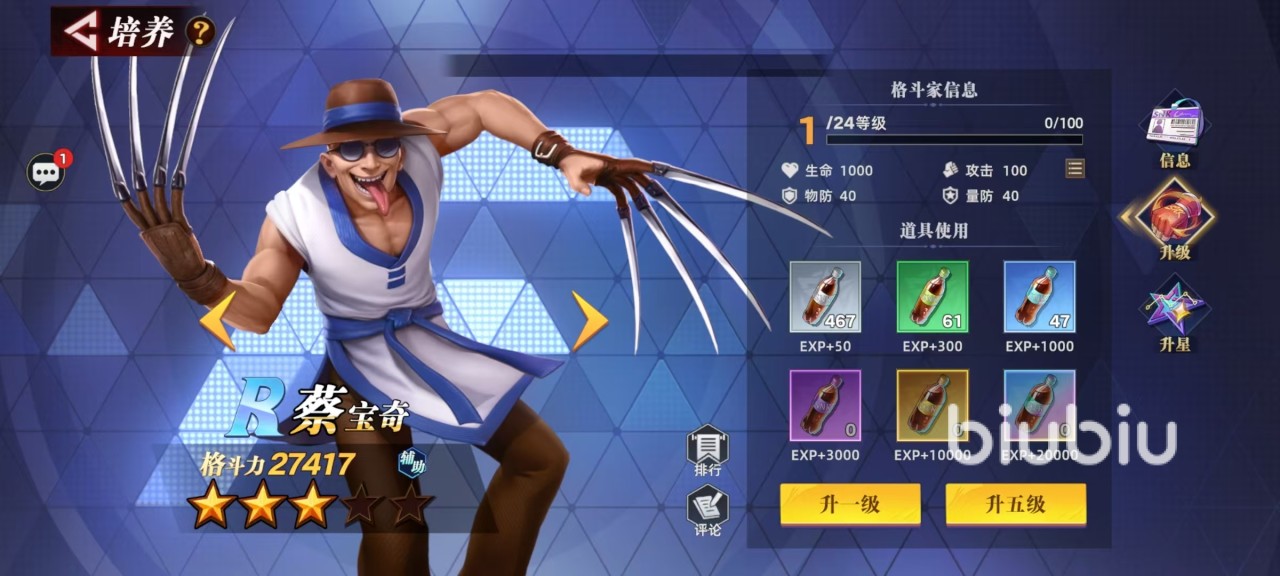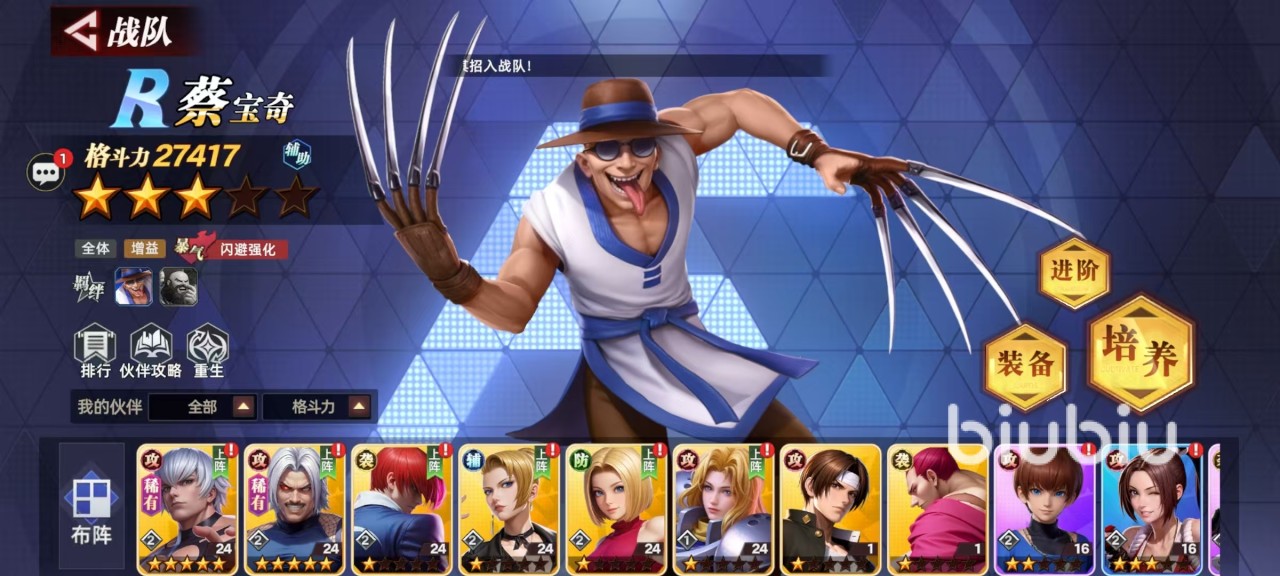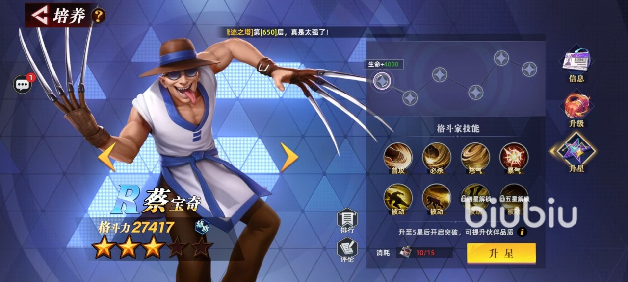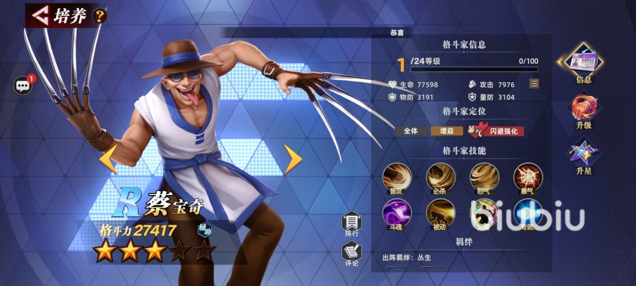 蔡宝奇是属于辅助性的角色,他在场上只要队友每次打出轻拳,都可以额外恢复怒气,当释放一次重拳后可以解锁爆气,提高5%最终免伤效果。必杀技可对敌方单体目标造成能量伤害,有30%几率降低对方5%防御,持续一回合,爆气效果下削弱效果提高,有60%的几率降低5%的防御。