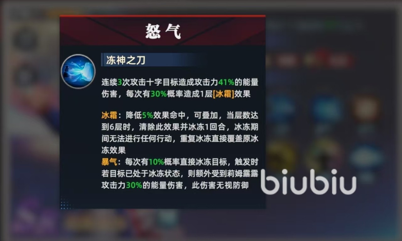 怒气技能是连续三次攻击十字目标,造成能量伤害后,每次攻击都有30%的几率造成一层冰霜效果。在爆气强化下,每次有10%几率直接冰冻目标,如果触发时目标已经被冰冻,则造成额外伤害。冰霜所带来的效果是降低对方的效果命中,可以叠加,当叠加到6层时,就能触发冰冻。冰冻期间对方无法进行任何行动,所以是很有效的控制手段。