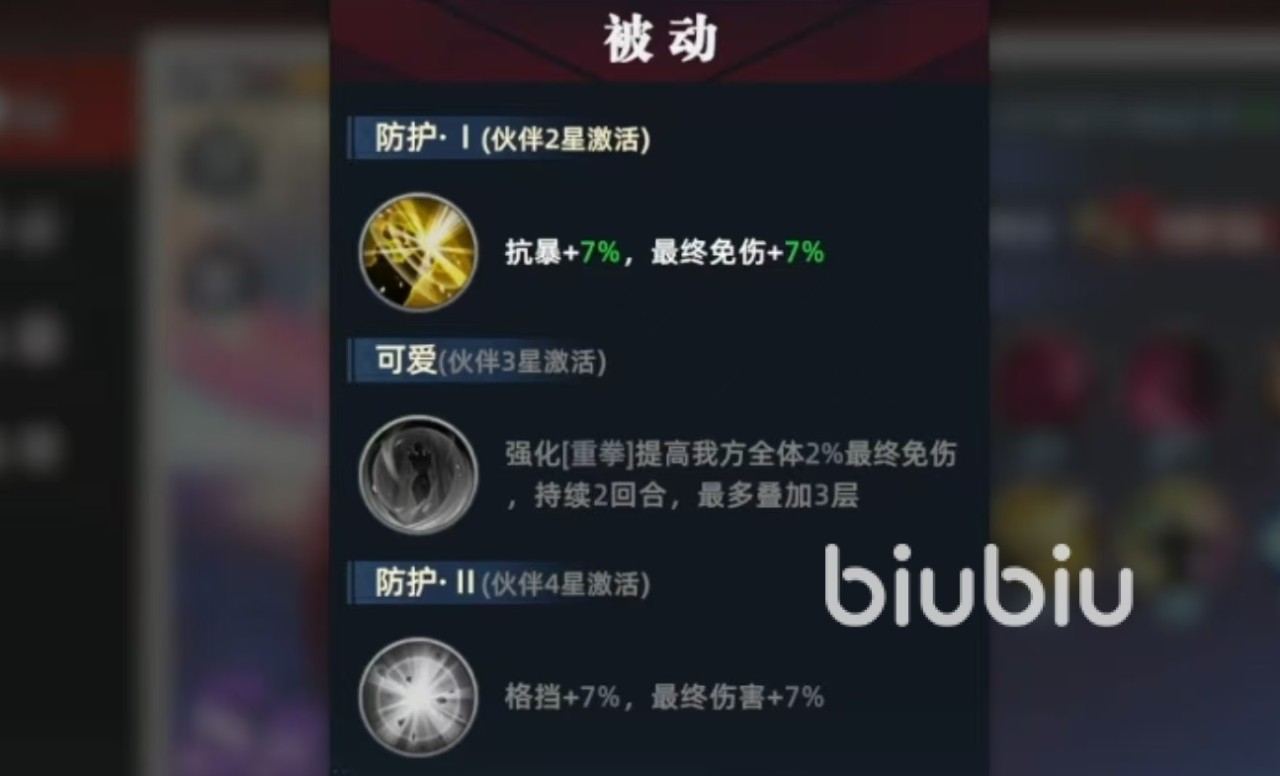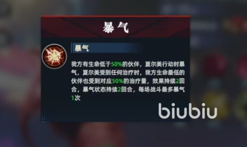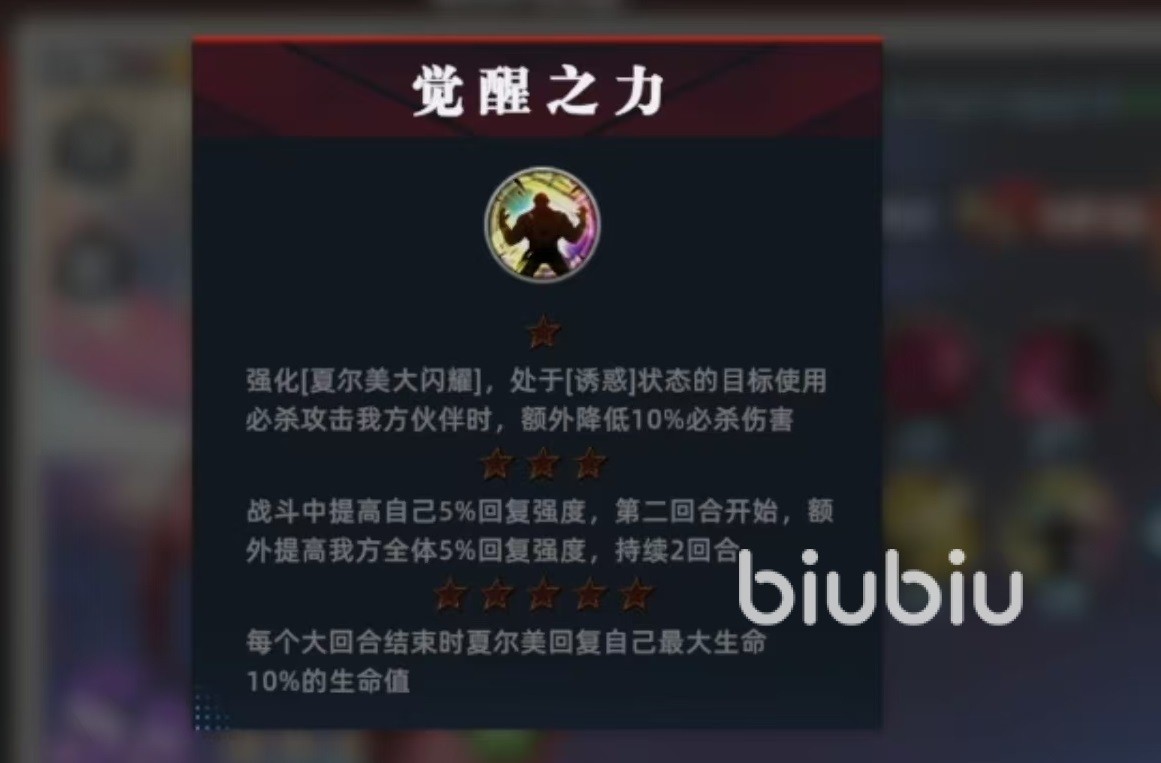 每当我方有生命值低于50%的伙伴时,夏尔美在行动时就能触发爆气,夏尔美受到任何治疗,我方生命最低的单目标也可以获得治疗量。在被动技能的影响下,夏尔美的强化重拳还可以提升我方全体的最终免伤效果,当叠加到三层之后,有6%的最终免伤属性加成,也是一个很有用的生存类型被动。在觉醒之后,强化之后的必杀技使得处于诱惑状态的目标,额外降低必杀伤害。在战斗中提升自身的回复强度,额外提升我方全体回复强度,以及在大回合结束后,夏尔美可以恢复生命值。