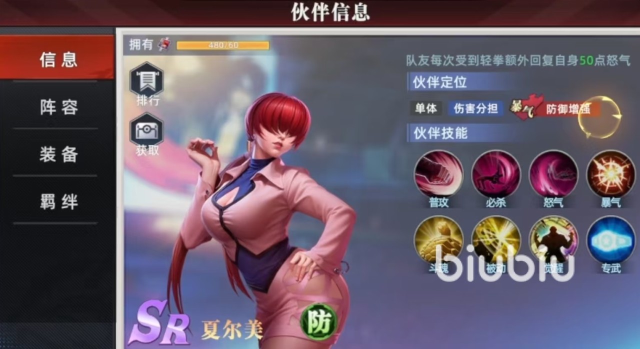 夏尔美的必杀技能是攻击对方单体目标,在造成物理伤害后,有60%的几率附加诱惑效果。对方在被成功诱惑后,使用普通攻击伤害我方伙伴,会降低其20%的普攻伤害,持续两个回合。如果必杀技处于爆气的强化状态下,那么将对敌方全体目标有40%的几率造成诱惑。这样的技能效果伤害尚在其次,但是削弱对方全体的普攻伤害,对于增强我方的生存能力非常有效,而且触发的几率并不算低。怒气技能效果是攻击对方单体目标,并恢复自身20%的最大生命值。在爆气的强化下,额外提高8%的最终免伤。对于一个坦克来说,恢复血量和增加免伤,都是非常有效的生存提升效果,使得夏尔美能够扛住更多的伤害。