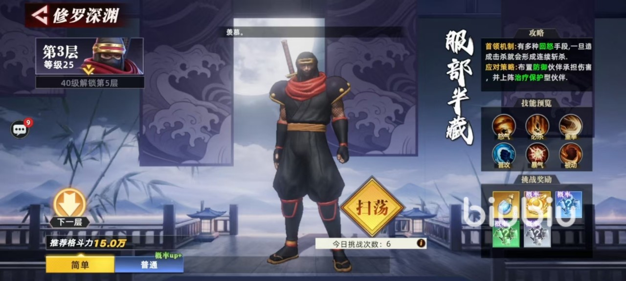 想要加入修罗深渊活动非常简单,通过找到服部半藏,然后对话之后直接就可以进入,修罗深渊是属于分层挑战的机制,大家可以查看每一层镇守的boss他们的机制以及具有的技能,这样就可以提前做到有针对性的进行选择。例如在第一层和第二层挑战的敌人都是霸王丸,第三层挑战的敌人是服部半藏,第四层挑战的敌人是天草四郎时贞。随着玩家等级不断提升,后续会开放更多的层数,例如达到40级才能开放第5层,后续也是如此。