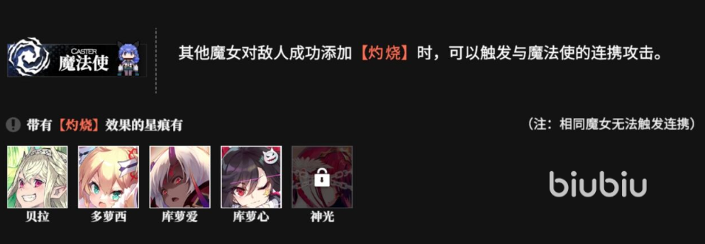 是因为灼烧效果与魔女的连携技机制天然契合,魔女之间的连携技往往是在敌方触发某种减益状态后立即发动一次额外攻击,而灼烧作为一种高频触发的持续减益效果,不仅能保证连携技的不断生效,还能同时提升全队的总输出量。灼烧队的核心魔女组合通常是【安洁】与【黑神月咏】。安洁是灼烧触发与连携的关键点,而黑神则是团队的主C,她的技能倍率和直伤能力让整个队伍在短时间内具备强大的清场与爆发力。除此之外,第三位核心人选可在【律】与【米娅】之间切换。律更偏向于破甲,在打BOSS时能让输出最大化;米娅则有更好的生存能力,让队伍容错率更高。