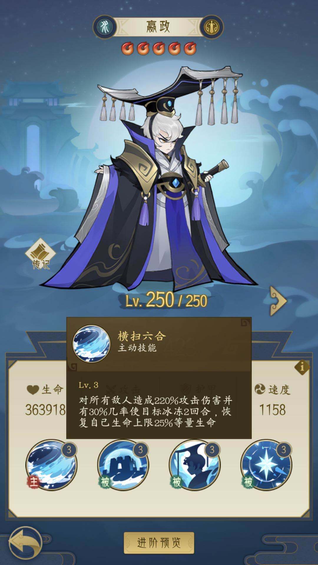 1.水系用嬴政,技能自带回血和控制,大招群体伤害,在等级远高于对方的情况下单卡通关的概率还是蛮高的,等级差不多概率直线下降。