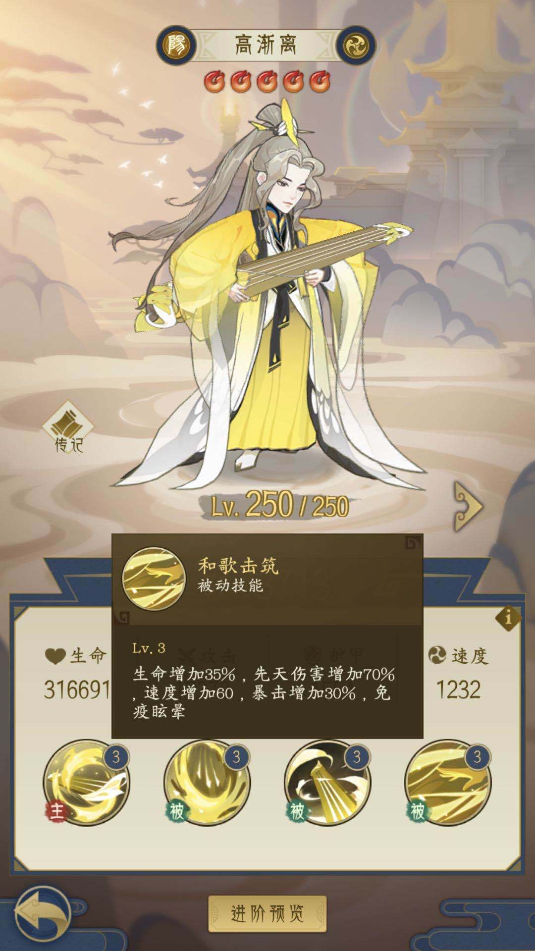 3.高渐离:最强侠隐卡牌不用争辩,大招稳定控制和输出,最BUG的是被动技能不受控制,解决了百分之90角色单卡通关的难题,前提是要有钱抽到他才行。