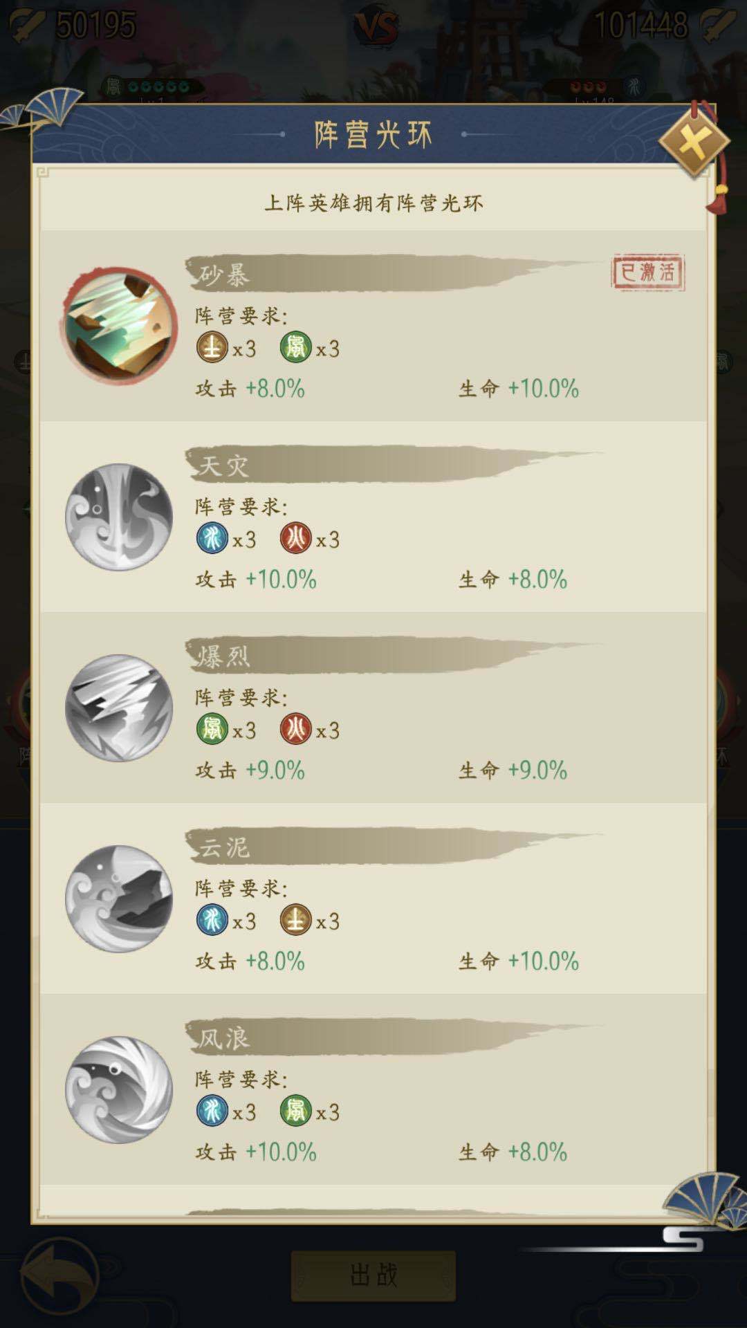 1.在前期的时候玩家可以使用同阵营体系达成光环效果,这个阶段玩家只能培养2个角色达到满级,另外四个位置完全就是打酱油的,因此可以放置4个同阵营的卡牌来凑成光环效果让满级的角色更加强。