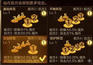 基础阵型 | 1% | 0.5% | 40%防御*2;20%攻击*3 |