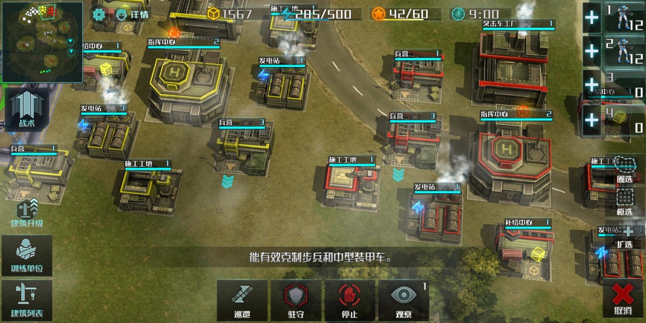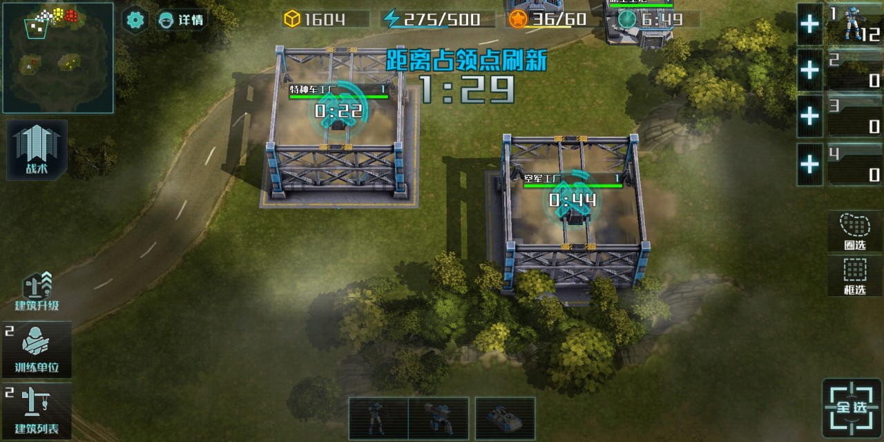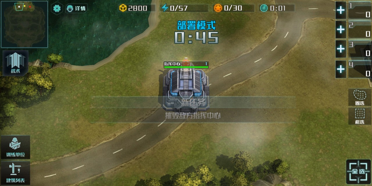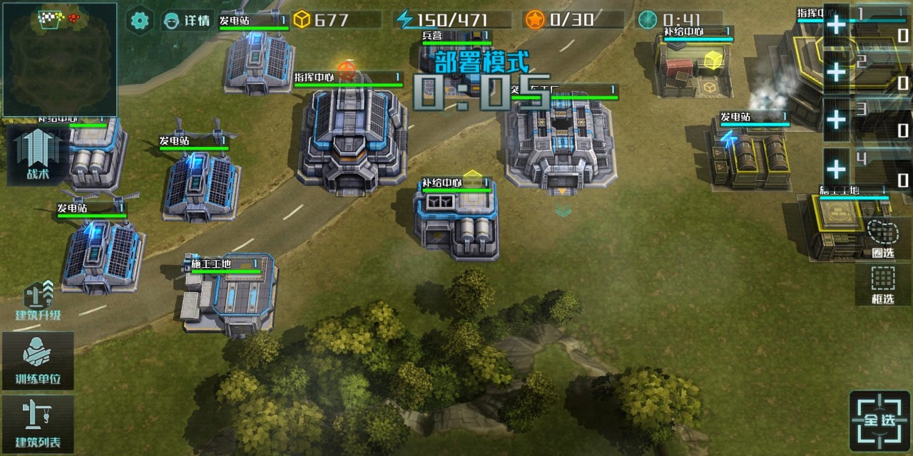 当对局开始后,所有玩家都会进入为时一分钟的部署模式,该模式下所有建筑的建造时间都会大大缩短。小编建议按照1施工工地+2发电站+2兵营+3补给中心的方案建造,其中补给中心能够持续生产维系基地的能源——补给。