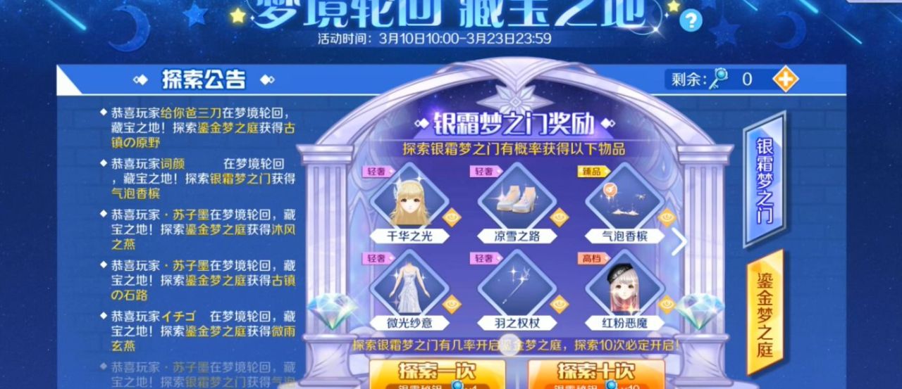 首先,此次的梦境轮回抽奖活动奖池可是十分丰厚的通过做任务可以获得银霜秘匙,但是系统通过做任务赠送的钥匙和充钱获得的是不一样的,因此抽到的奖励的概率也就相差很大了,做任务获得的一天一个钥匙只能有0.001%的概率,而充钱获得的概率为0.05%,虽然说都比较坑,但是相对于来说还是充钱的比较高一点。