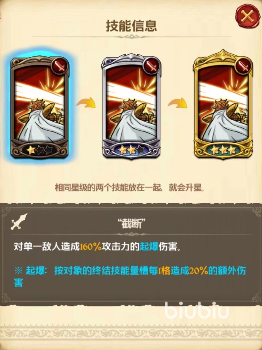 自身专属技能王的意志,每次受到伤害时,在下一回合都能够增加6%生命相关能力,最多能够触发5次。该技能效果重点提升的就是生存能力,而且越承受伤害,增加的效果也就越好,所以根本不怕对方攻击,第1个技能截断输出对方单一目标最多能造成400%攻击力的起爆伤害。起爆伤害拥有独特效果,将会在结算时根据输出对象所拥有能量槽能量来造成额外输出,每多一格能量槽,就能造成20%额外伤害。