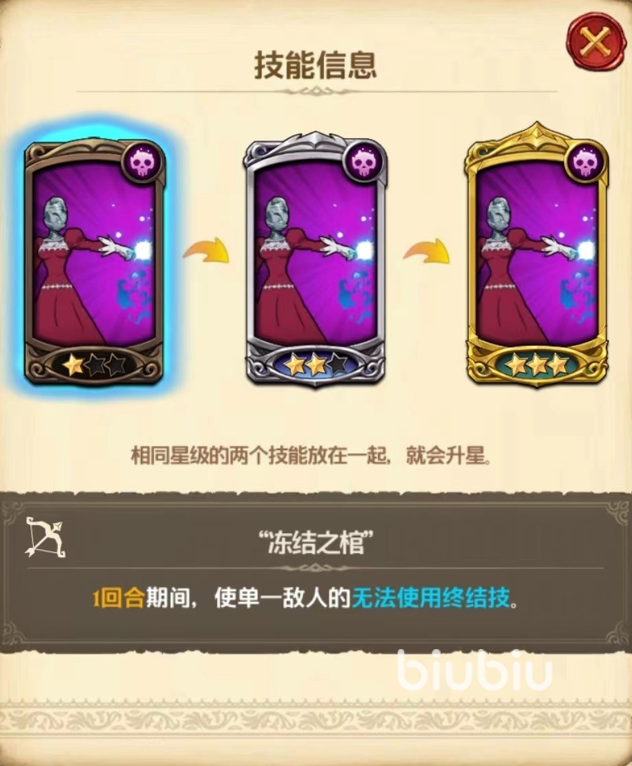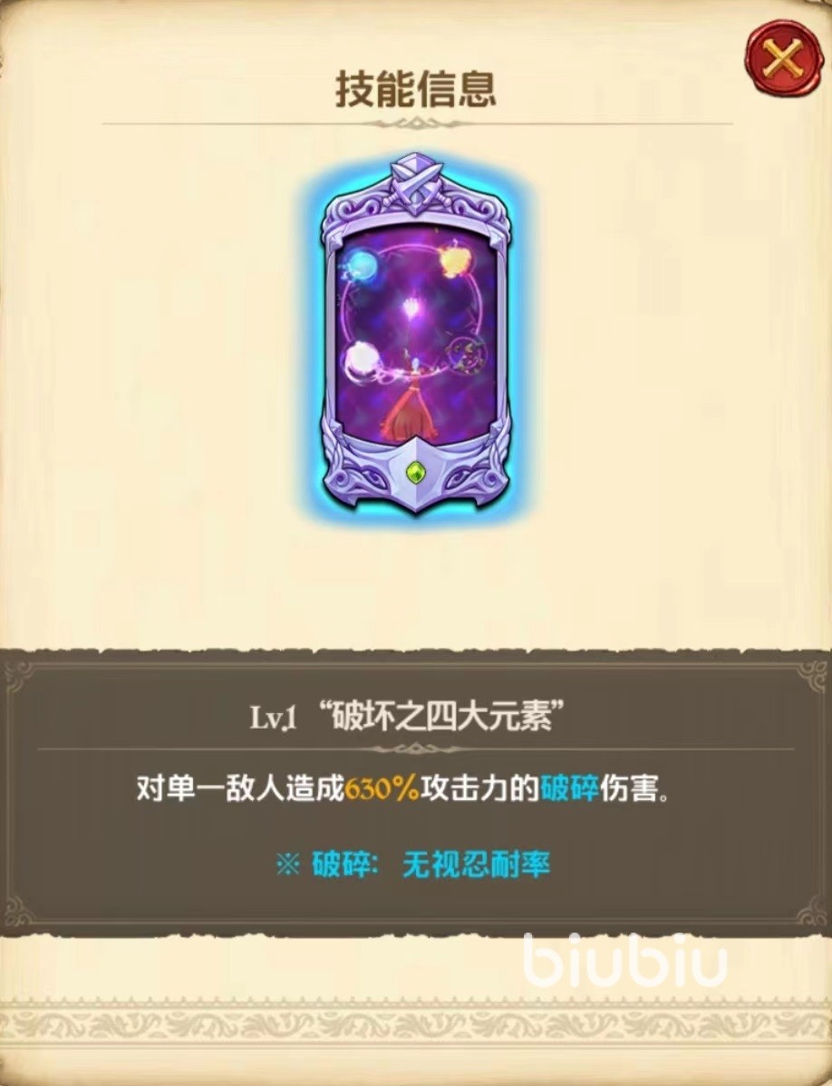 第2个技能冻结之棺,使对方单一目标在最多三回合期间里无法使用终结技,此技能如果使用时机过早,将会发挥不出应有效果,所以要在对方即将释放终结技之前进行限制,一星时只有一回合,只有达到三星时才会增加到三回合,所以升星之后提升效果非常明显,也是应该优先升级的技能。终结技破坏之四大元素,对单一敌人造成比例非常高的伤害,并且攻击力为破碎类型,能够无视对方忍耐率,在收割方面非常出色,对方残血目标基本抵挡不住。