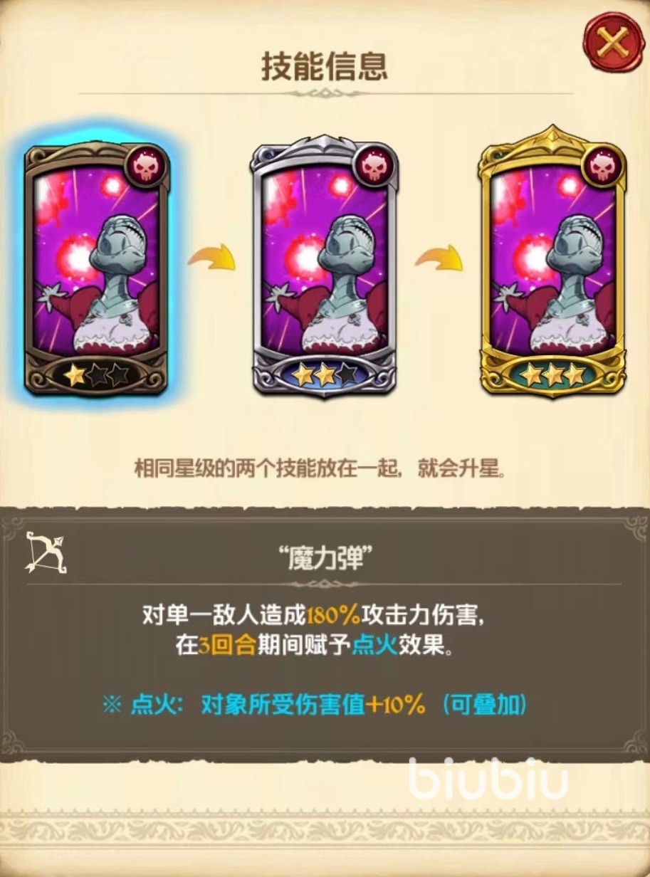 第1个技能魔力弹,伤害对方单一目标并在三个回合里附加点火效果,对方被点火之后接下来受到伤害提升,并且这是可以叠加状态。技能升星之后还能附加更好的效果,达到二星时可以解除目标身上架势,然后再计算伤害。达到三星时除了解除架势以及造成伤害更高之外,点火效果个数和持续回合都将增加。所以该技能是非常值得升星的一个效果,将会大大提升在战斗中的输出能力。