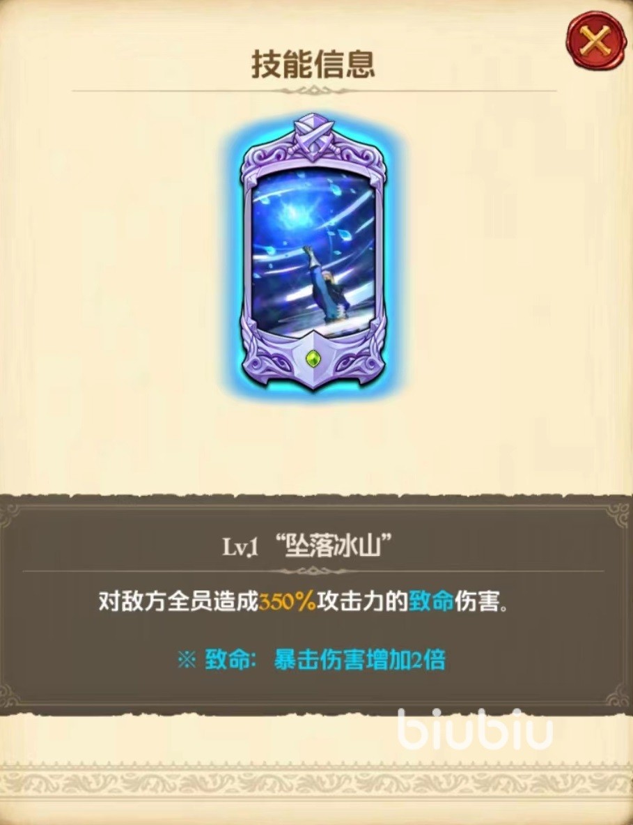 最后终结技能坠落冰山,是该角色灵魂效果,对敌方全体目标造成一次高额攻击力属性的致命伤害。致命效果是使暴击伤害增加两倍,这样一旦触发暴击,即使是群体输出技能,也能给对方带来极大打击。在同样品质角色里,该技能伤害效果绝对是极其出色的,甚至可以达到更高层次水准。了解了这些效果之后就会发现,该角色无愧于自身寒冰骑士称号,通过操控寒冰力量既有伤害又有控制。