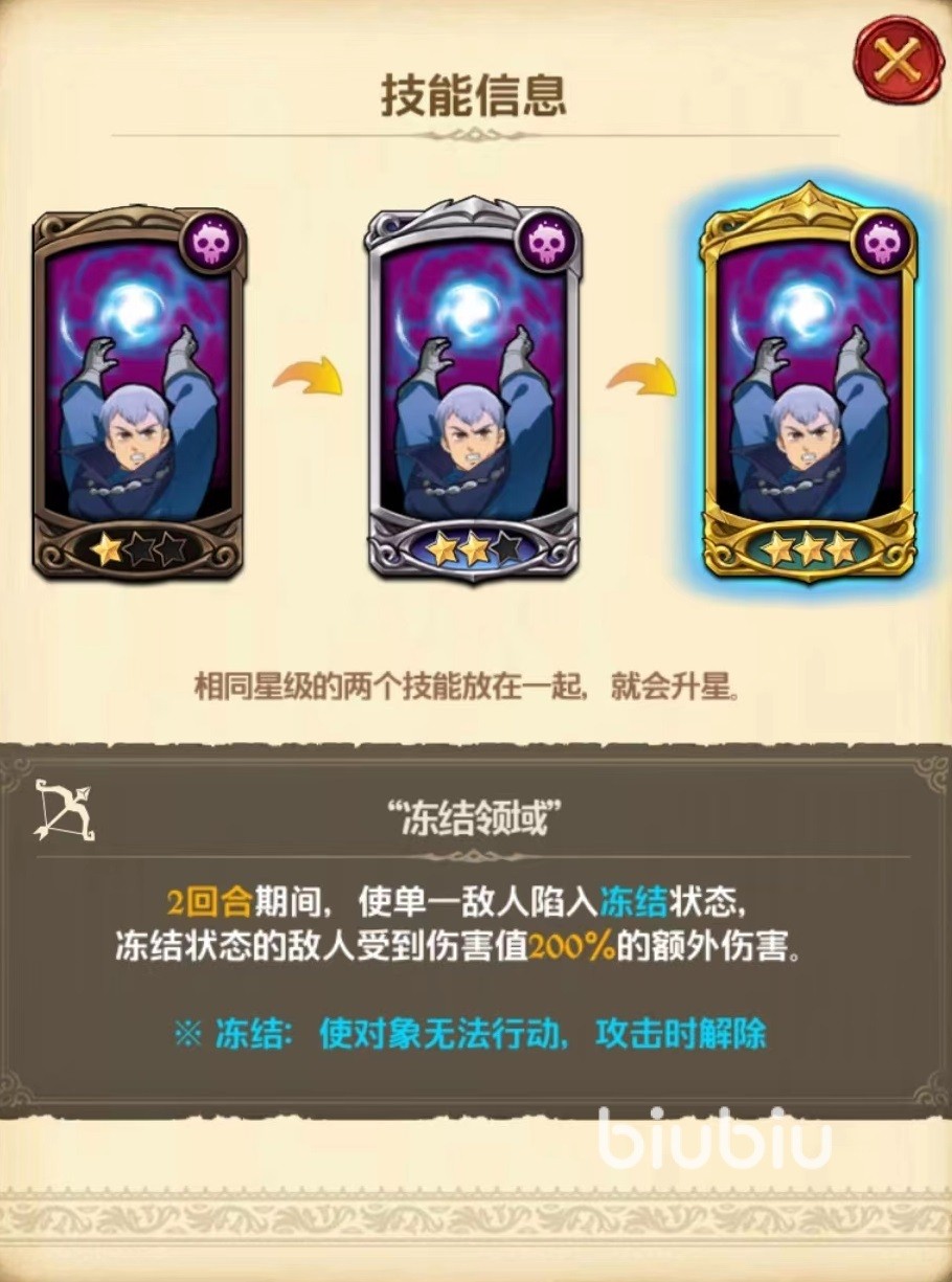所以该技能除了伤害较高之外,对于能够为自己加血以及提供辅助能力的敌方角色,都是很好的克制。第2个技能冻结领域,使对方在两回合期间内陷入冻结状态,被冻结之后敌人不仅会受到额外伤害,还不能进行任何行动,受到攻击时解除。冻结也是目前非常好用的控制效果,只要能掌握好攻击目标,使其吃满两回合控制,就能够带来优势。