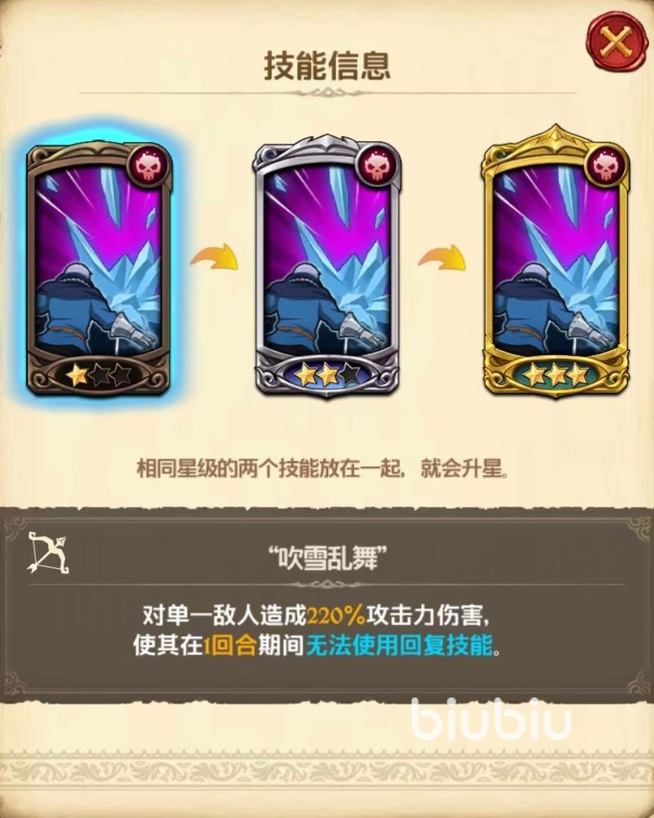 自身专属技能释放寒冰,在战斗开始时会按照英雄贯穿率来计算,降低敌方全体忍耐力,需要参战时才能生效。贯穿率是衡量进攻时的有效属性,而对方忍耐力和受到伤害相关,经过这样机能效果之后,就能够将我方输出角色攻击变得更加犀利。第1个输出技能吹雪乱舞,攻击对方单个目标,并使其在最多两回合期间内无法使用回复技能,回复技能包括为自己和为队友提供血量恢复的所有效果。