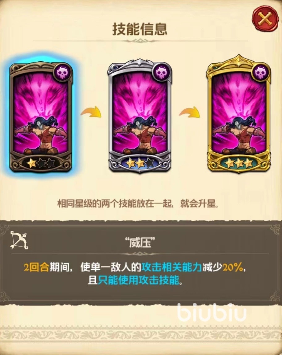 第2个技能威压,在三回合期间内使得单一敌方目标与攻击相关能力减少40%,并且只能使用攻击技能。该效果需要重点解释一下,降低攻击相关能力比较容易解释,就直接削弱了输出,但只能使用攻击技能是很大限制。因为很多角色技能并不仅仅是攻击,这点从卡牌图标就能看出,不能使用其他技能效果对绝大多数目标都是以很好的限制。