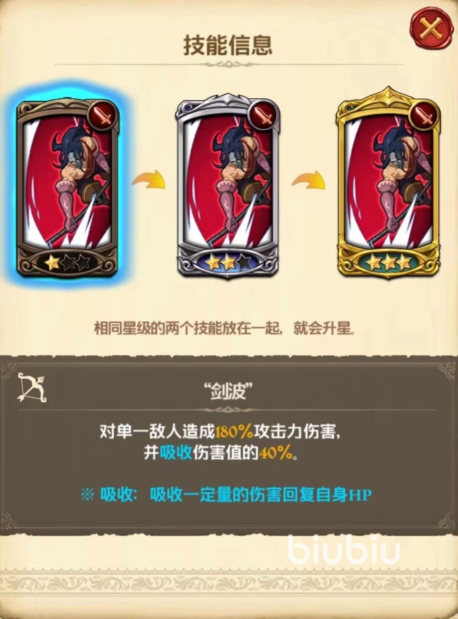 第1个技能剑波,对敌方单一目标造成伤害,并且根据伤害值比例吸收成为自身血量,也就相当于是气血恢复效果。达到三星时该技能攻击力伤害为400%,并且会将伤害值100%全部吸收过来,无论从伤害或是恢复效果来看,都是非常出色的,所以该技能也是比较适合用来升星。毕竟各项能力都能在升星之后得到加成,培养潜力很大。