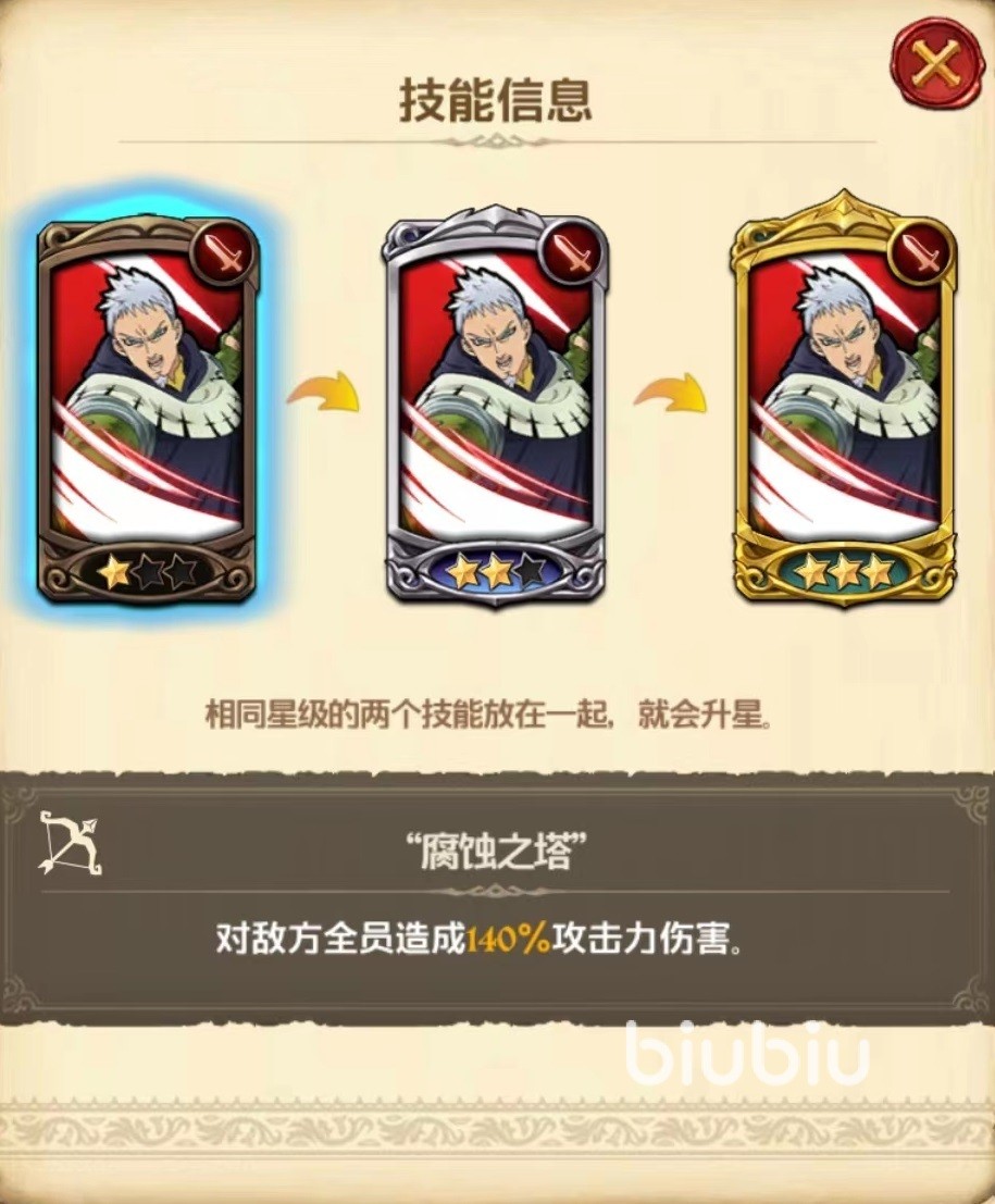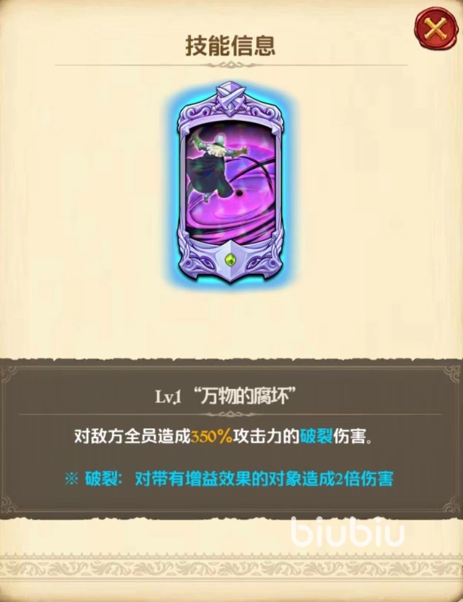 该角色专属技能弱点攻击,根据我方英雄所使用技能的次数提高贯穿率,每次都能提升5%,最多10次,这样综合计算下来,单单是贯穿率提升就已经非常出色,对于输出来说,贯穿率提高之后能够显著增加伤害。第1个技能腐蚀之塔,在一星时仅仅只有群体伤害效果,达到三星时,除了攻击力伤害提升之外,还能将对方所有目标身上增益效果和价值全部解除。解除了这些效果在实战中意义比伤害要更可观,毕竟很多角色就是依靠增益来提升状态。