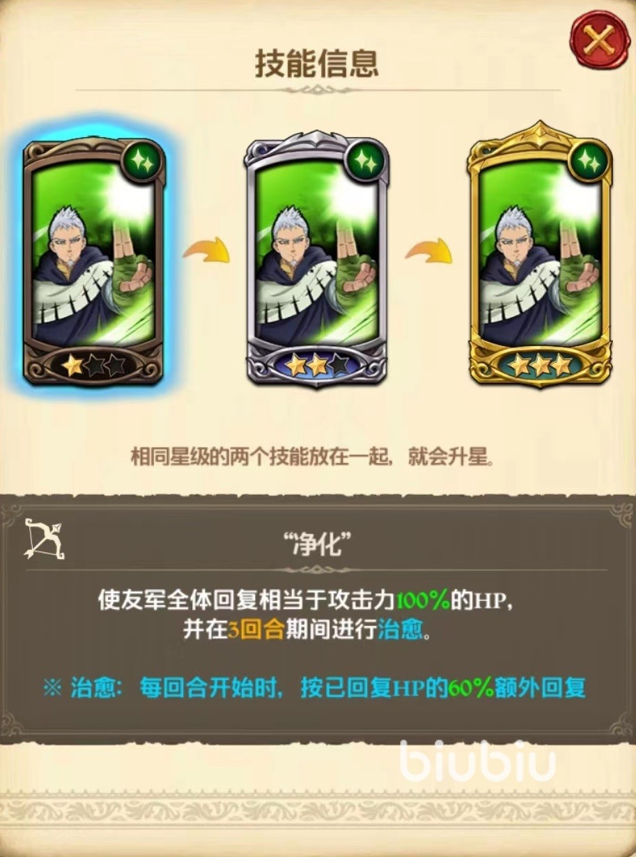 第2个技能净化,恢复友方所有目标血量,根据当前攻击力数值来计算,并且在三回合期间添加治愈状态。治愈属于持续治疗类型技能效果,每回合开始时会按照回复血量数值折算成比例后自动加血。所以从治疗量来计算,即使初次并不算高,但是将后续治愈所带来的叠加起来也会非常可观。