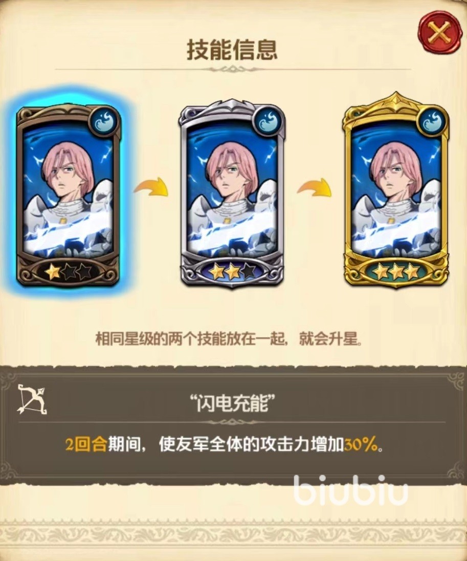 第2个技能闪电充能,三回合期间内我方全体目标攻击力能提升达到60%,该技能是需要重点升星类型。因为无论是持续回合或是增加攻击力,都会有明显提高,是目前非常出色的辅助技能,在爆发之前先打出这一套技能牌,后续伤害会变得非常可观。