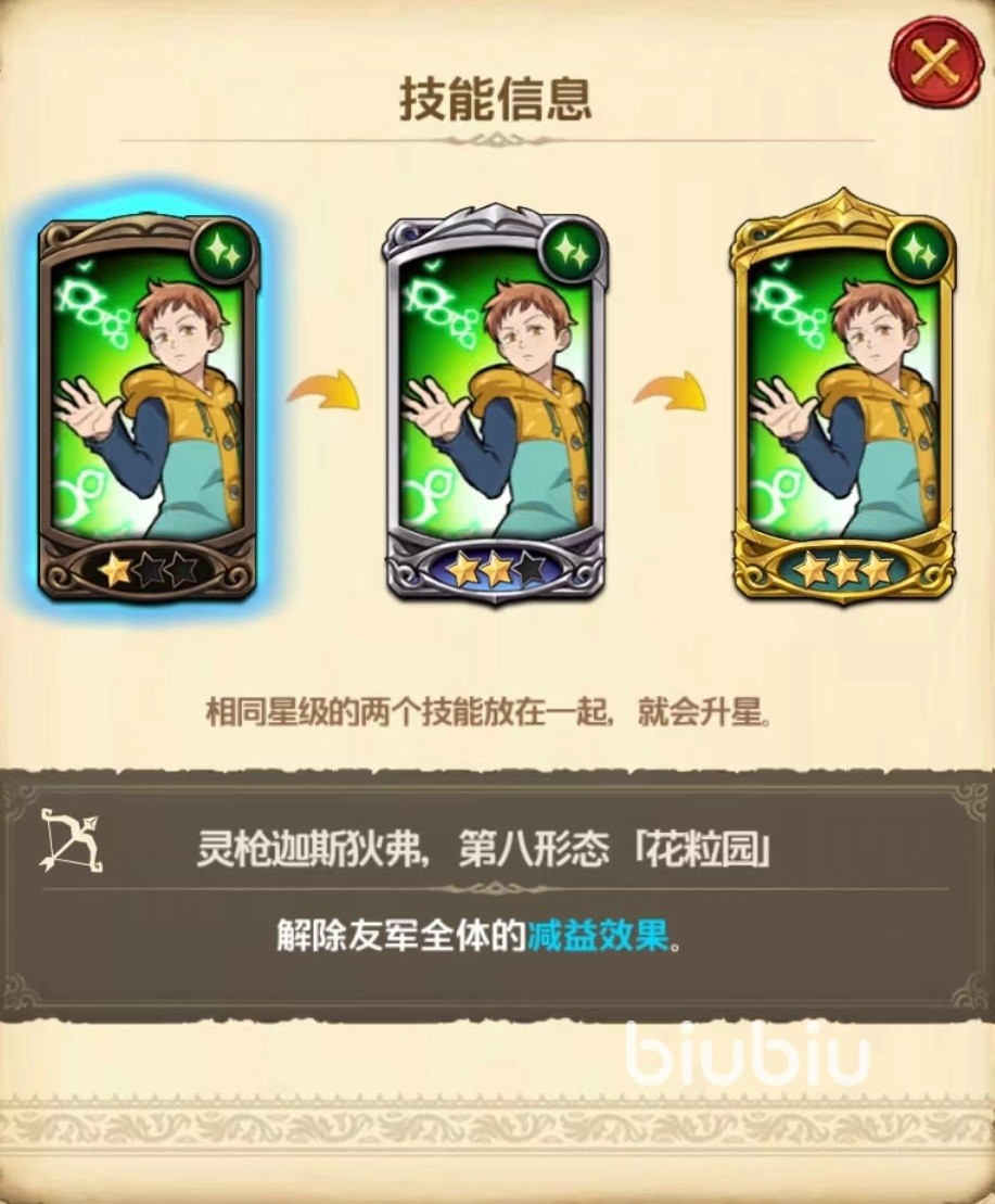 第2个技能,第八形态粒园,初始状态下只能够为我方全体目标解除身上减益效果,升到三星时除了解除减益之外,还能额外附加血量恢复,我方损失血量越多,恢复效果也就越出色。拥有了该技能也就相当于有了很强辅助能力,目前很多角色都有大量减益状态,这些状态会使玩家非常头疼,而拥有了解除减益效果能力,这些都会轻松很多。