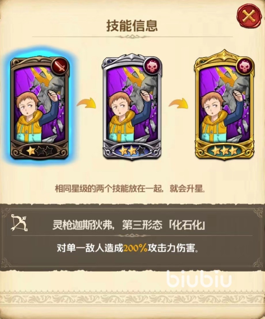第1个技能名称非常长,这里简称为第三形态化石化。作用是对单一敌人造成伤害,通过提升星级还能获得额外石化状态效果。两星时为一回合石化,三星时两回合,对方被石化之后无法进行任何行动,一旦受到攻击会直接解除。如果能把控好输出节奏,让对方吃满两个回合石化,那么是很强限制。即使该技能单体伤害输出并不算高,依靠控制效果也能发挥出很好的作用。