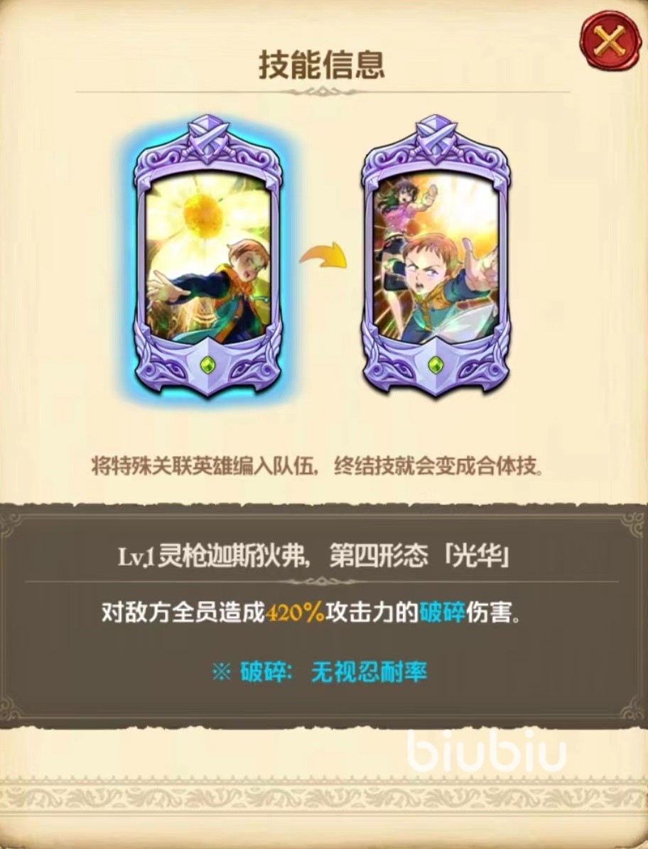 终结技为第四形态光华,对敌方全体目标造成一次高额伤害,而且附加破碎效果能无视对方忍耐力,输出更明显。合体技十字射击,在终结技基础上提高了少量伤害,但效果并不明显,所以没有必要为了触发合体技而专门使用关联英雄。专属技能妖精王,使我方所有妖精族英雄基础能力值增加8%,这是一个看似很美好的技能,但是使用起来限制很多,如果确实想走妖精族阵容搭配,那么金就是绝对核心。