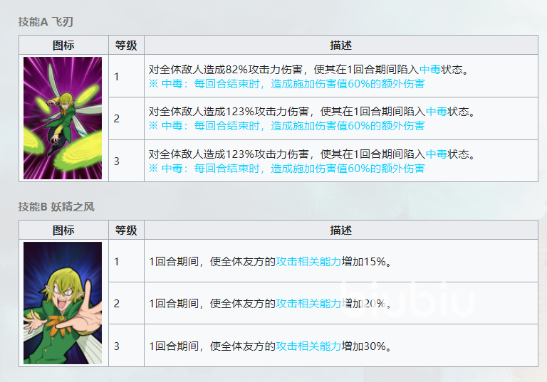 在目前阶段,海尔布拉姆的定级应该是A级的人物,他的一技能是给敌方全体造成伤害,并附带1回合的中毒。但因为中毒的伤害值不高。所以不能看做伤害技能,只能是把当做一个DEBUFF使用。二技能是让我们全体的攻击力上升,最高可以增加30%。但是只有一回合的增幅。说实话,这个持续时间确实短了点。