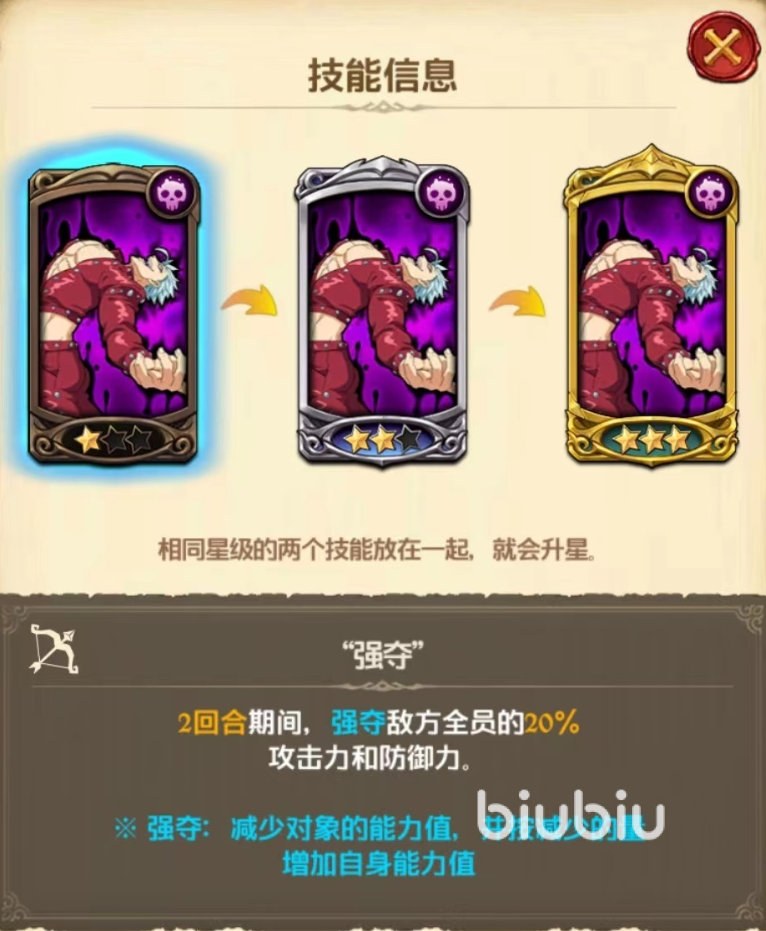 第二个技能叫做强夺,顾名思义,将对手身上的能力强制的抢过来为自己所用,按比例来抢夺对方身上的攻击力还有防御力,这个技能也挺有意思的,也是范围性的群体攻击技能。