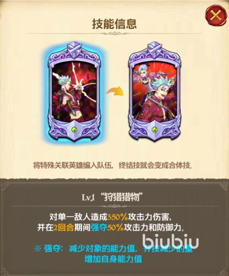 狩猎猎物是班的大招技能,这个技能不是群体范围攻击技能了,而是单体的攻击技能了,当然了,这个技能在两个回合之内还是能够对对方进行攻击力和防御力的抢夺,很豪横的一个技能,同时造成高额的损伤,适用于很多的阵容当中。