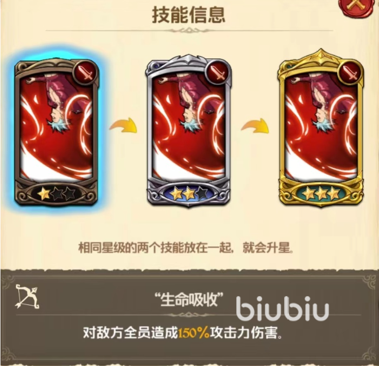 生命吸收是班的其中一个技能,是一个群体性的攻击技能,造成的伤害是范围性的,能够对对手阵营的全体英雄都造成损伤,两星的比例会提升至30%,三星当然就更加可观了。